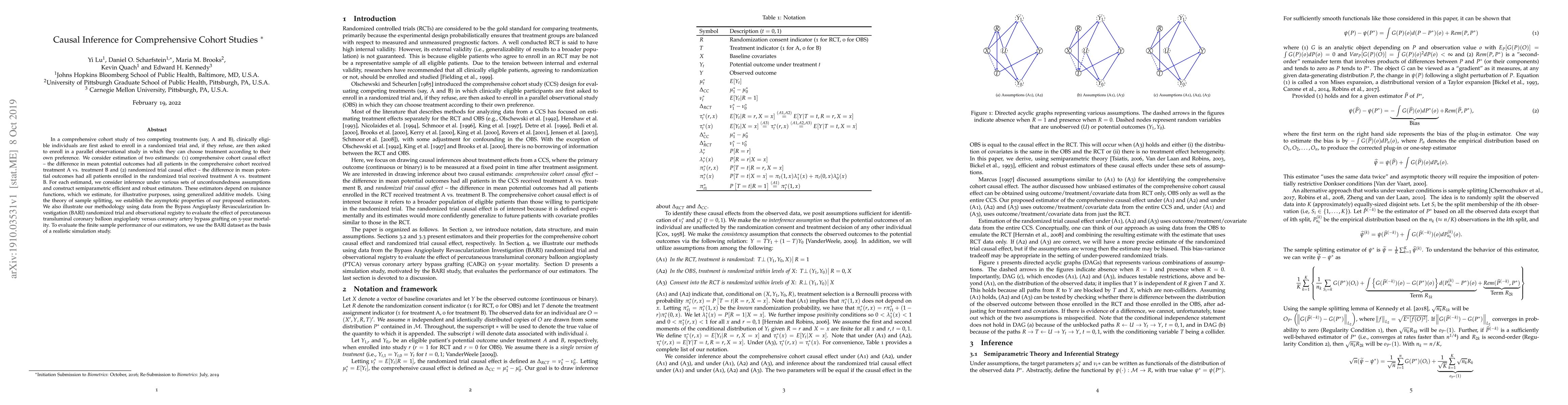 This paper develops semiparametric estimators for causal effects in comprehensive cohort studies involving randomized trials and observational data. It evaluates two estimands: the comprehensive cohort causal effect and the randomized trial causal effect, and uses generalized additive models to estimate nuisance functions, demonstrating the methodology with data from the BARI trial.
