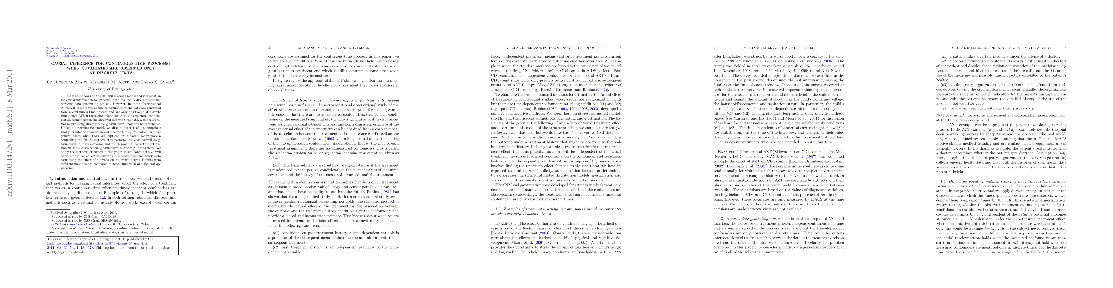Most of the work on the structural nested model and g-estimation for causal inference in longitudinal data assumes a discrete-time underlying data generating process. However, in some observational studies, it is more reasonable to assume that the data are generated from a continuous-time process and are only observable at discrete time points. When these circumstances arise, the sequential randomization assumption in the observed discrete-time data, which is essential in justifying discrete-time g-estimation, may not be reasonable. Under a deterministic model, we discuss other useful assumptions that guarantee the consistency of discrete-time g-estimation. In more general cases, when those assumptions are violated, we propose a controlling-the-future method that performs at least as well as g-estimation in most scenarios and which provides consistent estimation in some cases where g-estimation is severely inconsistent. We apply the methods discussed in this paper to simulated data, as well as to a data set collected following a massive flood in Bangladesh, estimating the effect of diarrhea on children's height. Results from different methods are compared in both simulation and the real application.