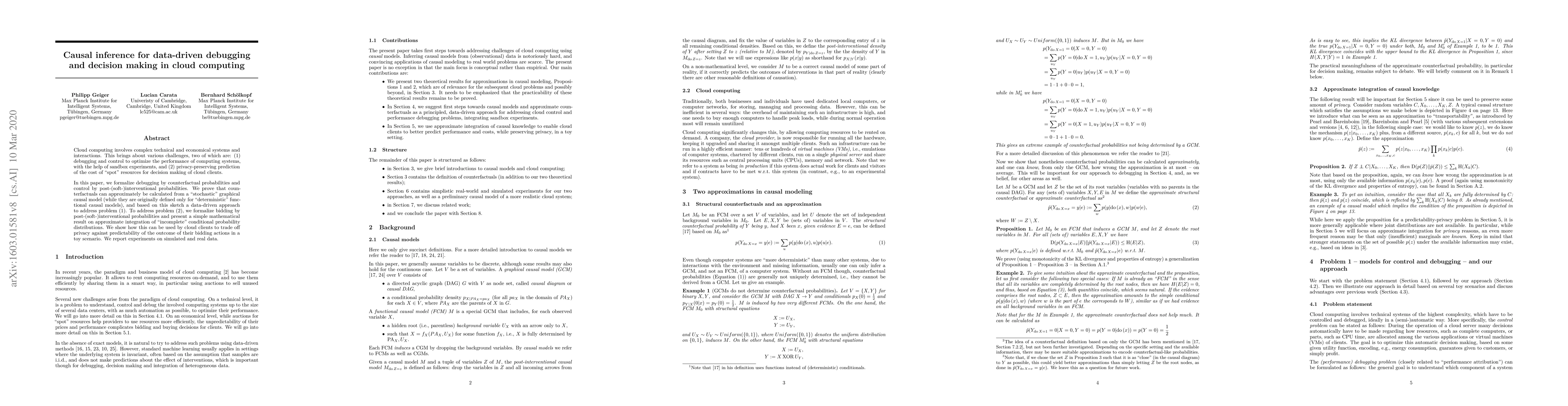 Cloud computing involves complex technical and economical systems and interactions. This brings about various challenges, two of which are: (1) debugging and control to optimize the performance of computing systems, with the help of sandbox experiments, and (2) privacy-preserving prediction of the cost of ``spot'' resources for decision making of cloud clients. In this paper, we formalize debugging by counterfactual probabilities and control by post-(soft-)interventional probabilities. We prove that counterfactuals can approximately be calculated from a ``stochastic'' graphical causal model (while they are originally defined only for ``deterministic'' functional causal models), and based on this sketch a data-driven approach to address problem (1). To address problem (2), we formalize bidding by post-(soft-)interventional probabilities and present a simple mathematical result on approximate integration of ``incomplete'' conditional probability distributions. We show how this can be used by cloud clients to trade off privacy against predictability of the outcome of their bidding actions in a toy scenario. We report experiments on simulated and real data.