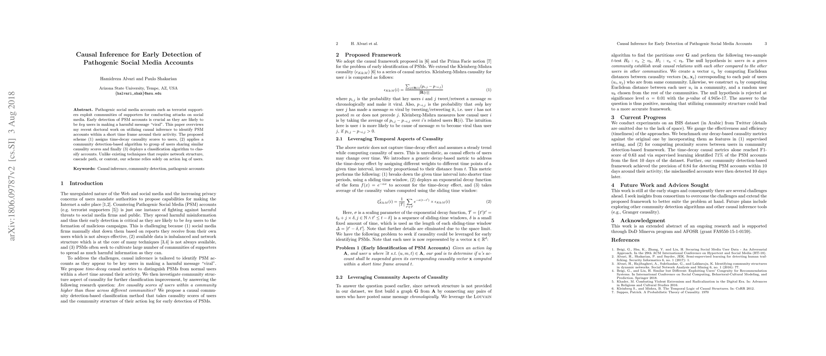 Pathogenic social media accounts such as terrorist supporters exploit communities of supporters for conducting attacks on social media. Early detection of PSM accounts is crucial as they are likely to be key users in making a harmful message "viral". This paper overviews my recent doctoral work on utilizing causal inference to identify PSM accounts within a short time frame around their activity. The proposed scheme (1) assigns time-decay causality scores to users, (2) applies a community detection-based algorithm to group of users sharing similar causality scores and finally (3) deploys a classification algorithm to classify accounts. Unlike existing techniques that require network structure, cascade path, or content, our scheme relies solely on action log of users.