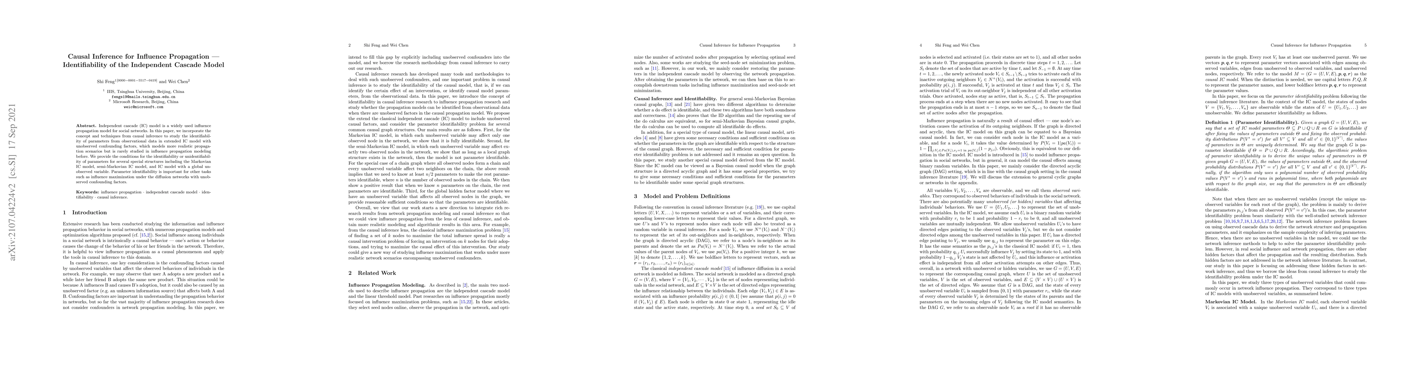 This paper explores the identifiability of parameters in the extended Independent Cascade model using causal inference techniques, addressing scenarios with unobserved confounding factors. It provides conditions for parameter identifiability in various special structures, which is crucial for tasks like influence maximization in diffusion networks.