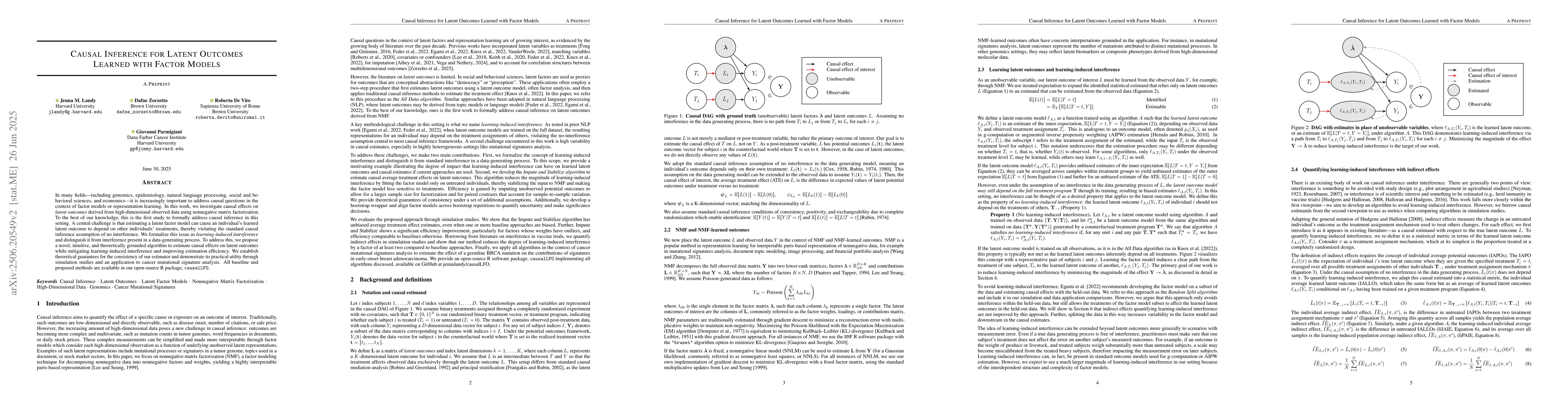 In many fields$\unicode{x2013}$including genomics, epidemiology, natural language processing, social and behavioral sciences, and economics$\unicode{x2013}$it is increasingly important to address causal questions in the context of factor models or representation learning. In this work, we investigate causal effects on $\textit{latent outcomes}$ derived from high-dimensional observed data using nonnegative matrix factorization. To the best of our knowledge, this is the first study to formally address causal inference in this setting. A central challenge is that estimating a latent factor model can cause an individual's learned latent outcome to depend on other individuals' treatments, thereby violating the standard causal inference assumption of no interference. We formalize this issue as $\textit{learning-induced interference}$ and distinguish it from interference present in a data-generating process. To address this, we propose a novel, intuitive, and theoretically grounded algorithm to estimate causal effects on latent outcomes while mitigating learning-induced interference and improving estimation efficiency. We establish theoretical guarantees for the consistency of our estimator and demonstrate its practical utility through simulation studies and an application to cancer mutational signature analysis. All baseline and proposed methods are available in our open-source R package, ${\tt causalLFO}$.