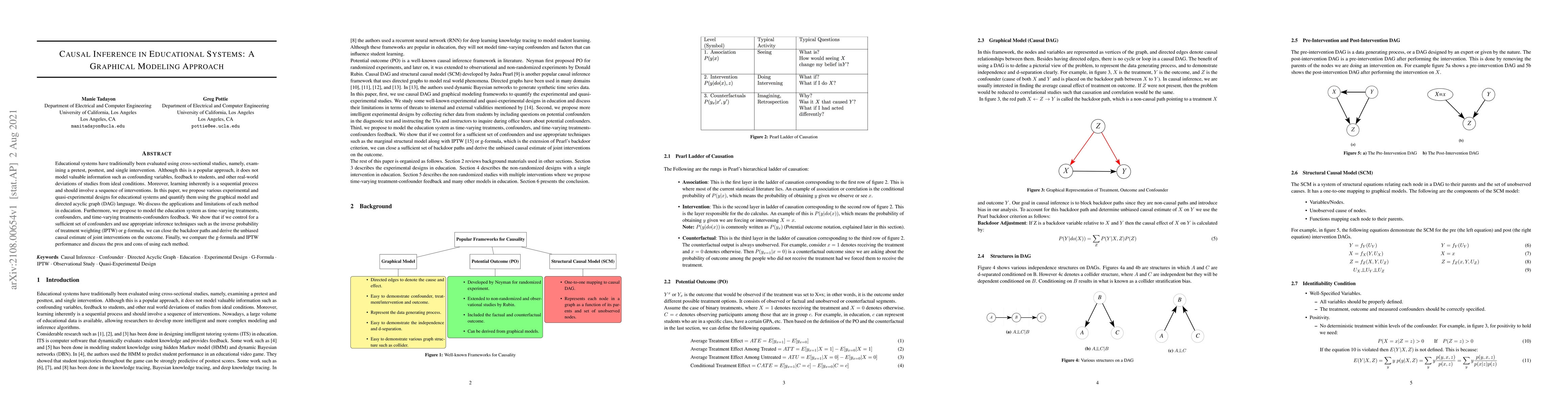 Educational systems have traditionally been evaluated using cross-sectional studies, namely, examining a pretest, posttest, and single intervention. Although this is a popular approach, it does not model valuable information such as confounding variables, feedback to students, and other real-world deviations of studies from ideal conditions. Moreover, learning inherently is a sequential process and should involve a sequence of interventions. In this paper, we propose various experimental and quasi-experimental designs for educational systems and quantify them using the graphical model and directed acyclic graph (DAG) language. We discuss the applications and limitations of each method in education. Furthermore, we propose to model the education system as time-varying treatments, confounders, and time-varying treatments-confounders feedback. We show that if we control for a sufficient set of confounders and use appropriate inference techniques such as the inverse probability of treatment weighting (IPTW) or g-formula, we can close the backdoor paths and derive the unbiased causal estimate of joint interventions on the outcome. Finally, we compare the g-formula and IPTW performance and discuss the pros and cons of using each method.