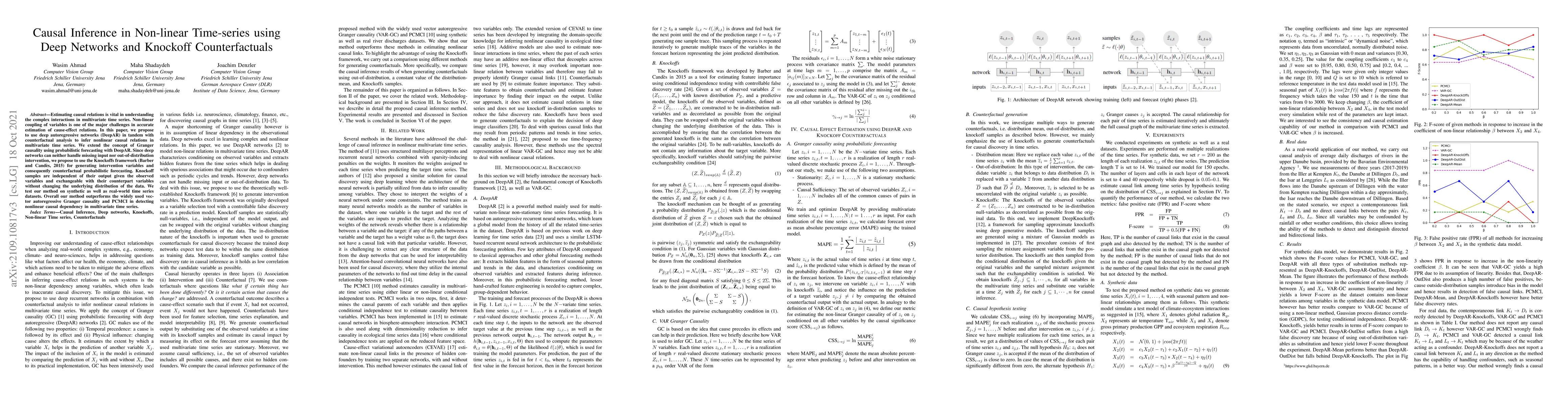 Estimating causal relations is vital in understanding the complex interactions in multivariate time series. Non-linear coupling of variables is one of the major challenges inaccurate estimation of cause-effect relations. In this paper, we propose to use deep autoregressive networks (DeepAR) in tandem with counterfactual analysis to infer nonlinear causal relations in multivariate time series. We extend the concept of Granger causality using probabilistic forecasting with DeepAR. Since deep networks can neither handle missing input nor out-of-distribution intervention, we propose to use the Knockoffs framework (Barberand Cand`es, 2015) for generating intervention variables and consequently counterfactual probabilistic forecasting. Knockoff samples are independent of their output given the observed variables and exchangeable with their counterpart variables without changing the underlying distribution of the data. We test our method on synthetic as well as real-world time series datasets. Overall our method outperforms the widely used vector autoregressive Granger causality and PCMCI in detecting nonlinear causal dependency in multivariate time series.