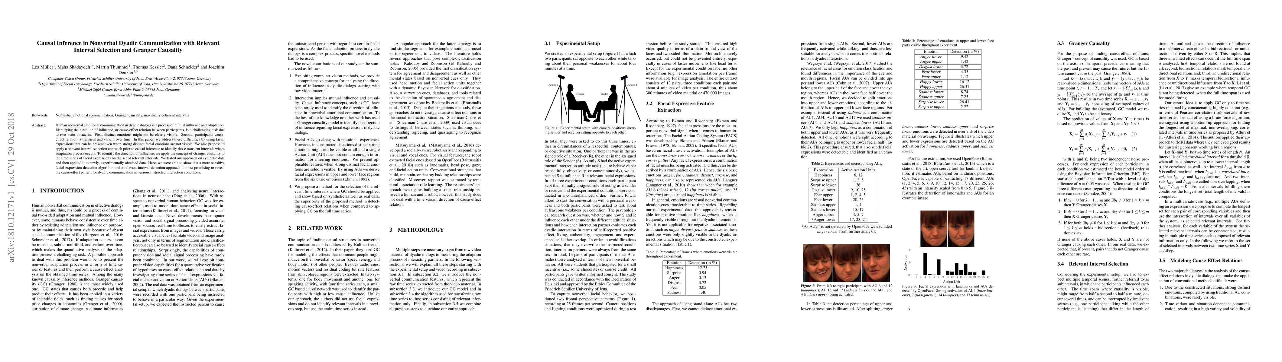 Human nonverbal emotional communication in dyadic dialogs is a process of mutual influence and adaptation. Identifying the direction of influence, or cause-effect relation between participants is a challenging task, due to two main obstacles. First, distinct emotions might not be clearly visible. Second, participants cause-effect relation is transient and variant over time. In this paper, we address these difficulties by using facial expressions that can be present even when strong distinct facial emotions are not visible. We also propose to apply a relevant interval selection approach prior to causal inference to identify those transient intervals where adaptation process occurs. To identify the direction of influence, we apply the concept of Granger causality to the time series of facial expressions on the set of relevant intervals. We tested our approach on synthetic data and then applied it to newly, experimentally obtained data. Here, we were able to show that a more sensitive facial expression detection algorithm and a relevant interval detection approach is most promising to reveal the cause-effect pattern for dyadic communication in various instructed interaction conditions.