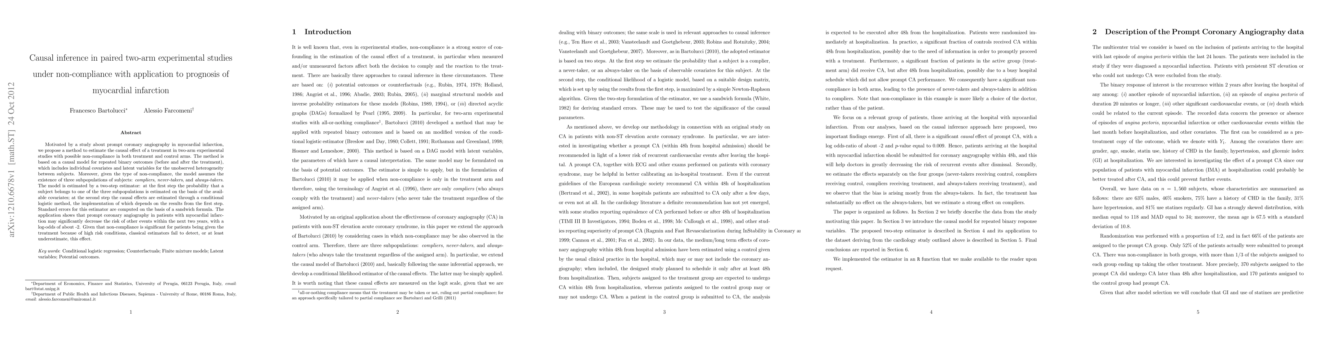 Motivated by a study about prompt coronary angiography in myocardial infarction, we propose a method to estimate the causal effect of a treatment in two-arm experimental studies with possible non-compliance in both treatment and control arms. The method is based on a causal model for repeated binary outcomes (before and after the treatment), which includes individual covariates and latent variables for the unobserved heterogeneity between subjects. Moreover, given the type of non-compliance, the model assumes the existence of three subpopulations of subjects: compliers, never-takers, and always-takers. The model is estimated by a two-step estimator: at the first step the probability that a subject belongs to one of the three subpopulations is estimated on the basis of the available covariates; at the second step the causal effects are estimated through a conditional logistic method, the implementation of which depends on the results from the first step. Standard errors for this estimator are computed on the basis of a sandwich formula. The application shows that prompt coronary angiography in patients with myocardial infarction may significantly decrease the risk of other events within the next two years, with a log-odds of about -2. Given that non-compliance is significant for patients being given the treatment because of high risk conditions, classical estimators fail to detect, or at least underestimate, this effect.