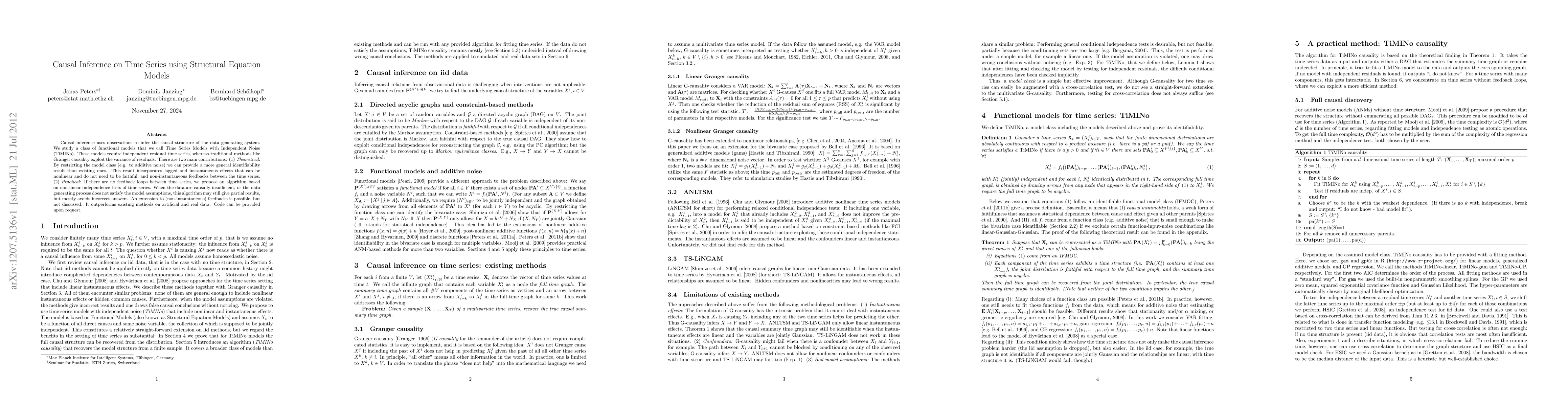 Causal inference uses observations to infer the causal structure of the data generating system. We study a class of functional models that we call Time Series Models with Independent Noise (TiMINo). These models require independent residual time series, whereas traditional methods like Granger causality exploit the variance of residuals. There are two main contributions: (1) Theoretical: By restricting the model class (e.g. to additive noise) we can provide a more general identifiability result than existing ones. This result incorporates lagged and instantaneous effects that can be nonlinear and do not need to be faithful, and non-instantaneous feedbacks between the time series. (2) Practical: If there are no feedback loops between time series, we propose an algorithm based on non-linear independence tests of time series. When the data are causally insufficient, or the data generating process does not satisfy the model assumptions, this algorithm may still give partial results, but mostly avoids incorrect answers. An extension to (non-instantaneous) feedbacks is possible, but not discussed. It outperforms existing methods on artificial and real data. Code can be provided upon request.