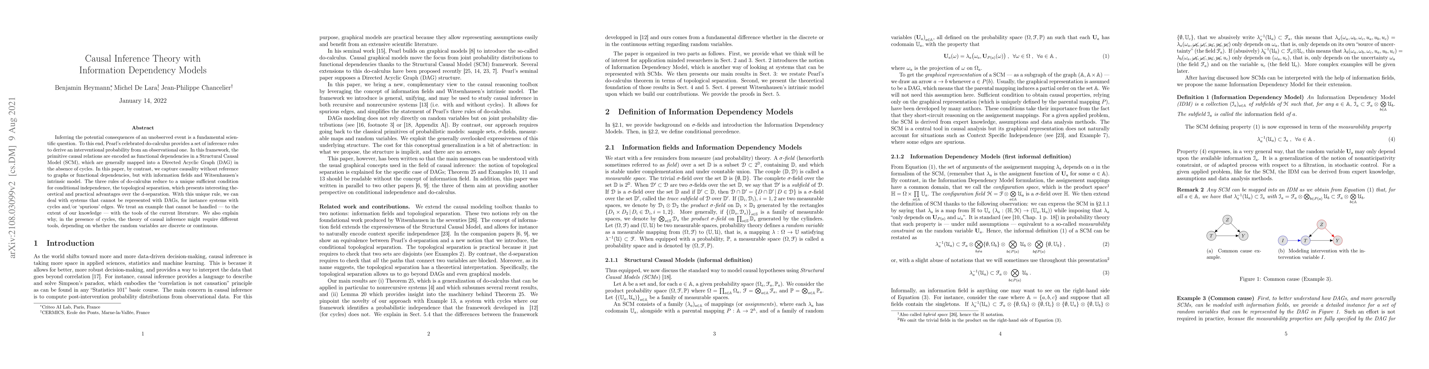 Inferring the potential consequences of an unobserved event is a fundamental scientific question. To this end, Pearl's celebrated do-calculus provides a set of inference rules to derive an interventional probability from an observational one. In this framework, the primitive causal relations are encoded as functional dependencies in a Structural Causal Model (SCM), which are generally mapped into a Directed Acyclic Graph (DAG) in the absence of cycles. In this paper, by contrast, we capture causality without reference to graphs or functional dependencies, but with information fields and Witsenhausen's intrinsic model. The three rules of do-calculus reduce to a unique sufficient condition for conditional independence, the topological separation, which presents interesting theoretical and practical advantages over the d-separation. With this unique rule, we can deal with systems that cannot be represented with DAGs, for instance systems with cycles and/or 'spurious' edges. We treat an example that cannot be handled-to the extent of our knowledge-with the tools of the current literature. We also explain why, in the presence of cycles, the theory of causal inference might require different tools, depending on whether the random variables are discrete or continuous.