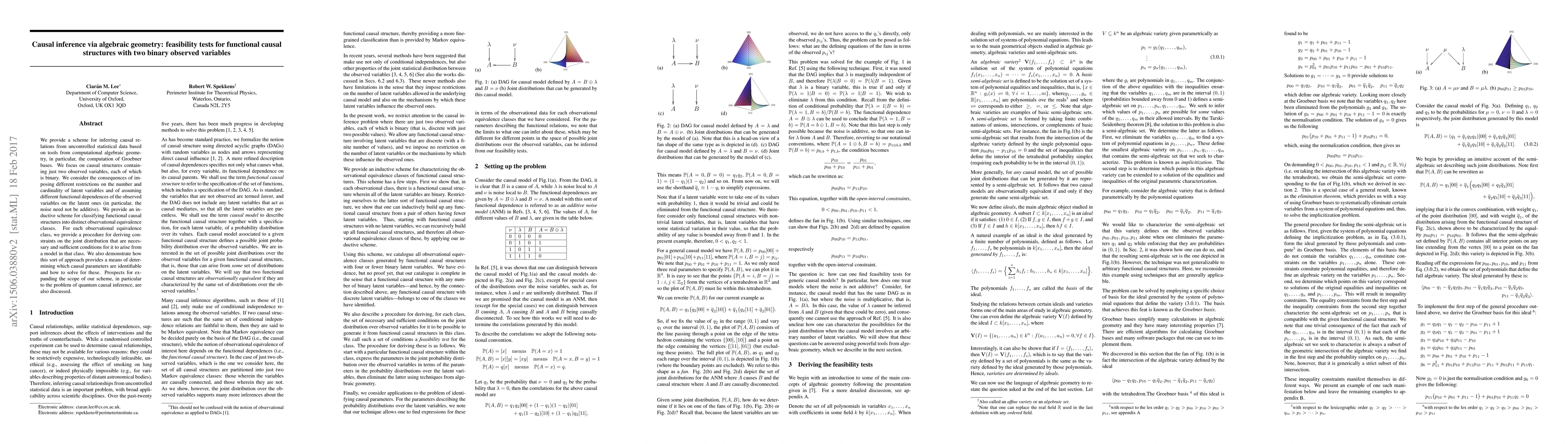 We provide a scheme for inferring causal relations from uncontrolled statistical data based on tools from computational algebraic geometry, in particular, the computation of Groebner bases. We focus on causal structures containing just two observed variables, each of which is binary. We consider the consequences of imposing different restrictions on the number and cardinality of latent variables and of assuming different functional dependences of the observed variables on the latent ones (in particular, the noise need not be additive). We provide an inductive scheme for classifying functional causal structures into distinct observational equivalence classes. For each observational equivalence class, we provide a procedure for deriving constraints on the joint distribution that are necessary and sufficient conditions for it to arise from a model in that class. We also demonstrate how this sort of approach provides a means of determining which causal parameters are identifiable and how to solve for these. Prospects for expanding the scope of our scheme, in particular to the problem of quantum causal inference, are also discussed.