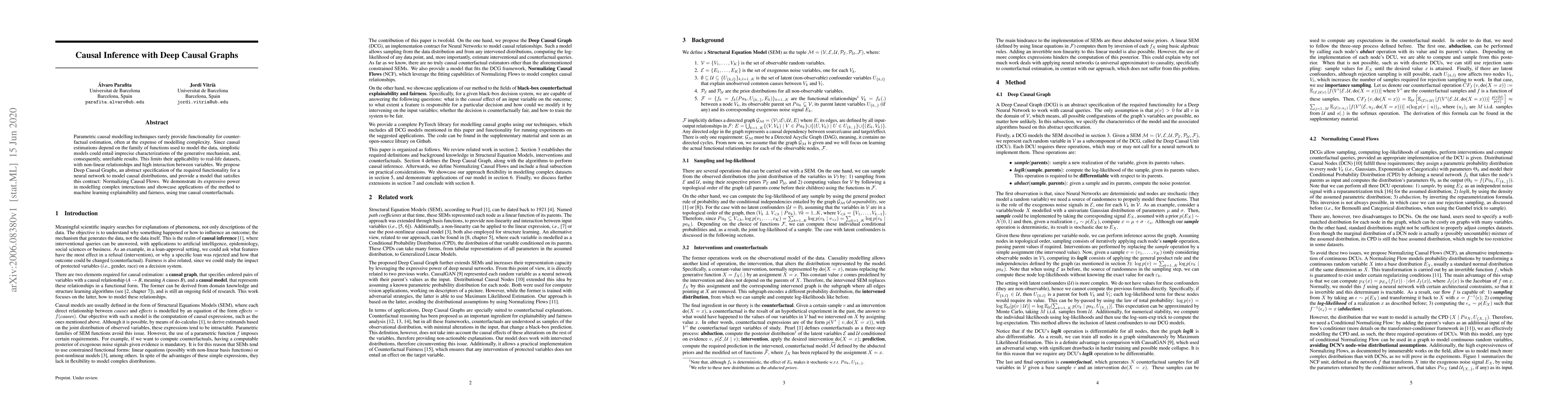 Parametric causal modelling techniques rarely provide functionality for counterfactual estimation, often at the expense of modelling complexity. Since causal estimations depend on the family of functions used to model the data, simplistic models could entail imprecise characterizations of the generative mechanism, and, consequently, unreliable results. This limits their applicability to real-life datasets, with non-linear relationships and high interaction between variables. We propose Deep Causal Graphs, an abstract specification of the required functionality for a neural network to model causal distributions, and provide a model that satisfies this contract: Normalizing Causal Flows. We demonstrate its expressive power in modelling complex interactions and showcase applications of the method to machine learning explainability and fairness, using true causal counterfactuals.