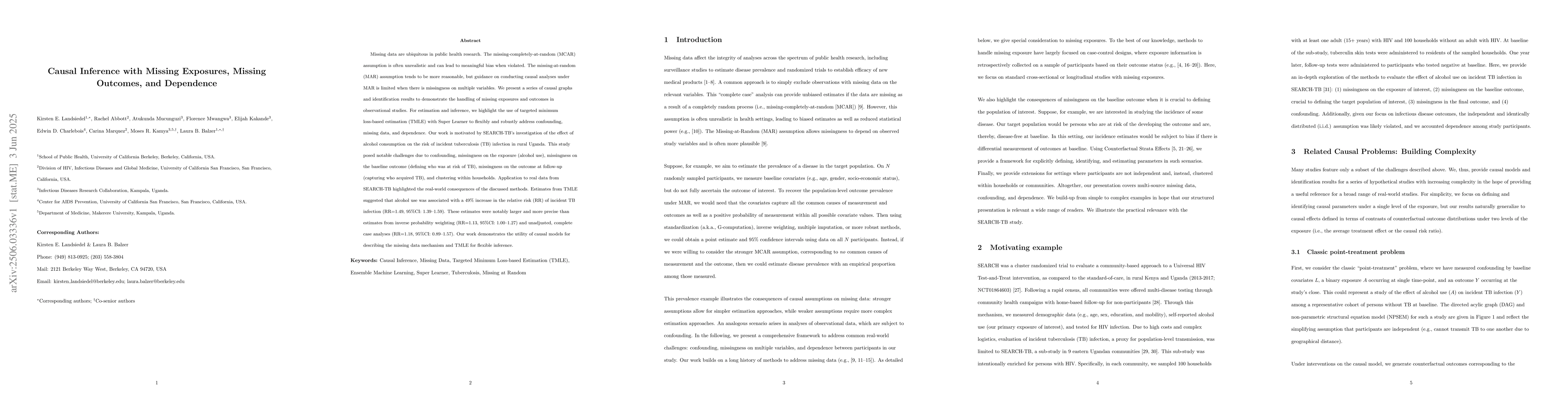 Missing data are ubiquitous in public health research. The missing-completely-at-random (MCAR) assumption is often unrealistic and can lead to meaningful bias when violated. The missing-at-random (MAR) assumption tends to be more reasonable, but guidance on conducting causal analyses under MAR is limited when there is missingness on multiple variables. We present a series of causal graphs and identification results to demonstrate the handling of missing exposures and outcomes in observational studies. For estimation and inference, we highlight the use of targeted minimum loss-based estimation (TMLE) with Super Learner to flexibly and robustly address confounding, missing data, and dependence. Our work is motivated by SEARCH-TB's investigation of the effect of alcohol consumption on the risk of incident tuberculosis (TB) infection in rural Uganda. This study posed notable challenges due to confounding, missingness on the exposure (alcohol use), missingness on the baseline outcome (defining who was at risk of TB), missingness on the outcome at follow-up (capturing who acquired TB), and clustering within households. Application to real data from SEARCH-TB highlighted the real-world consequences of the discussed methods. Estimates from TMLE suggested that alcohol use was associated with a 49% increase in the relative risk (RR) of incident TB infection (RR=1.49, 95%CI: 1.39-1.59). These estimates were notably larger and more precise than estimates from inverse probability weighting (RR=1.13, 95%CI: 1.00-1.27) and unadjusted, complete case analyses (RR=1.18, 95%CI: 0.89-1.57). Our work demonstrates the utility of causal models for describing the missing data mechanism and TMLE for flexible inference.