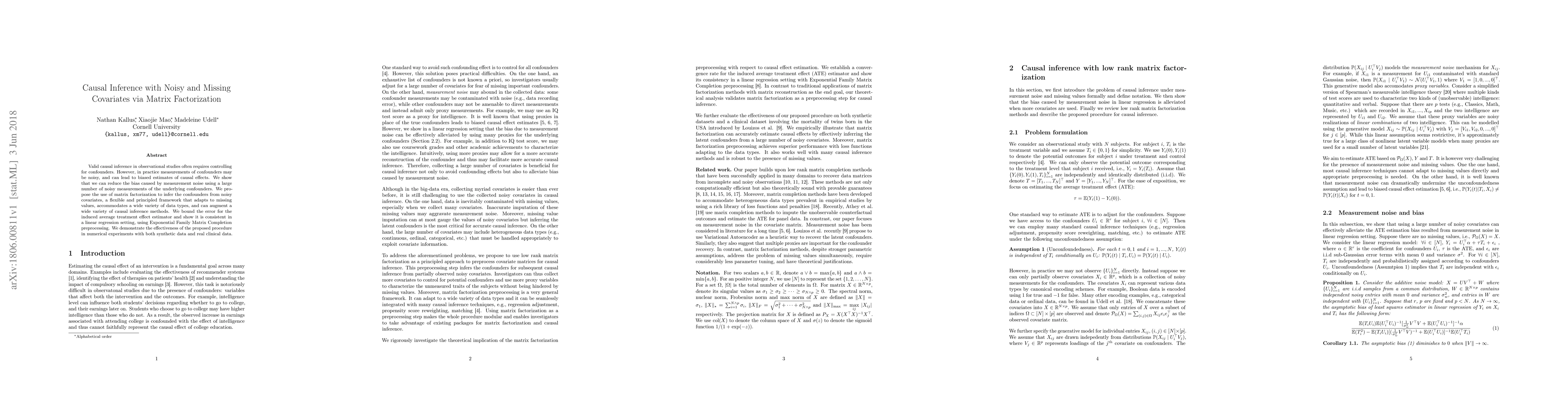 This paper proposes a matrix factorization approach to infer latent confounders from noisy and missing covariates, thereby reducing bias in causal inference. It demonstrates consistency of the average treatment effect estimator in linear regression settings and validates the method through synthetic and real clinical data experiments.
