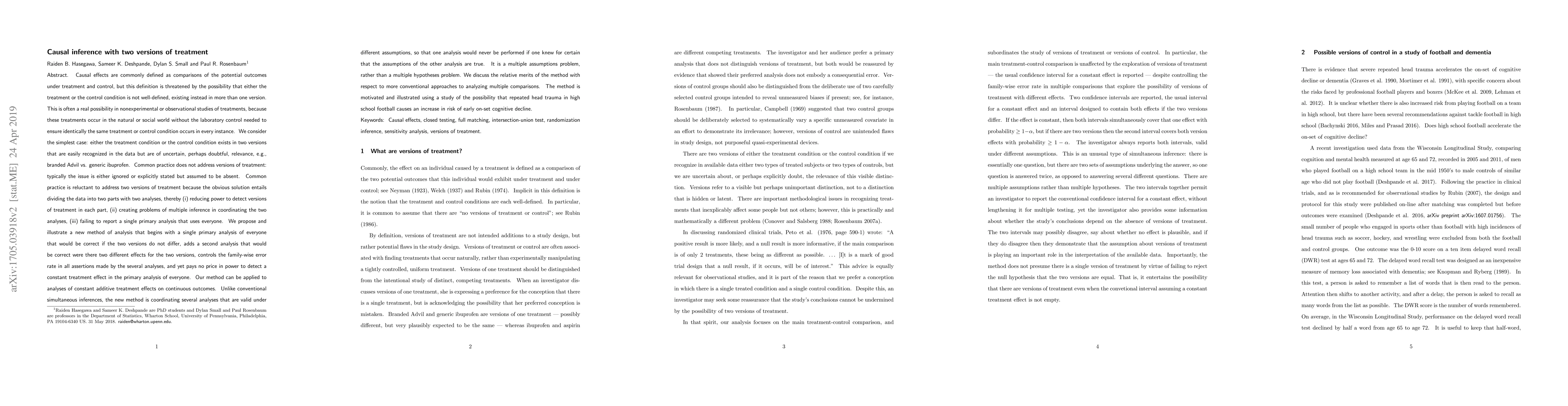 This paper proposes a new analysis method to address the ambiguity when treatment or control conditions exist in two versions with different effects. The method maintains power for the main treatment-control comparison, offers insights into version effects, and controls error rates across multiple comparisons, illustrated using a study on football-related head trauma and early dementia risk.