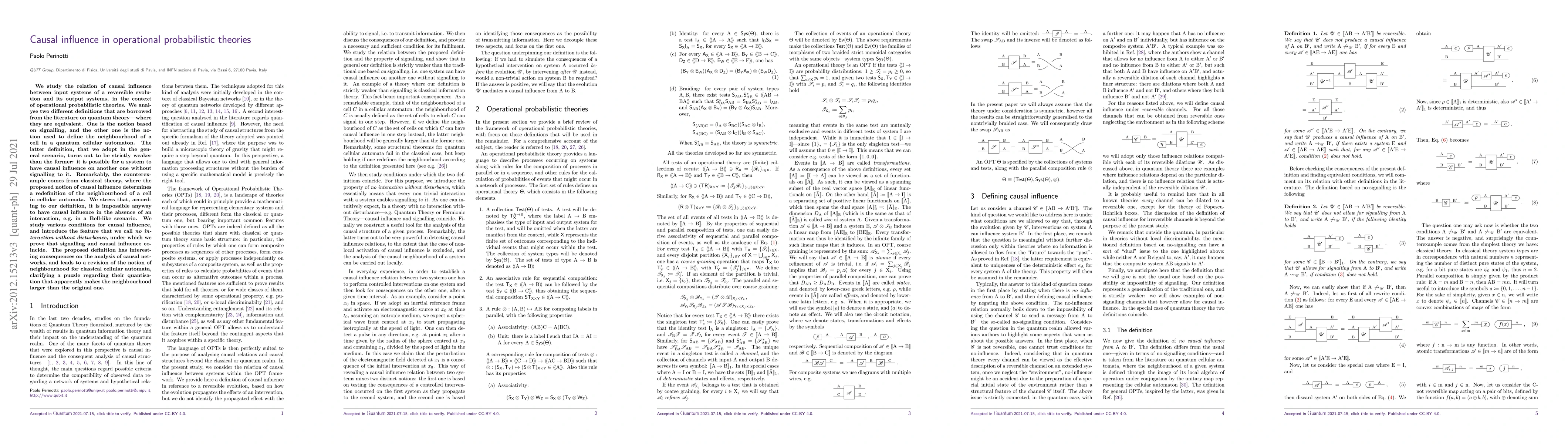 This paper explores causal influence in operational probabilistic theories, comparing two definitions borrowed from quantum theory. It finds that one definition, based on signalling, is stronger than the other, which allows causal influence without signalling, even in classical contexts. The study concludes that causal influence requires interaction, and introduces a condition where signalling and causal influence coincide, impacting the analysis of causal networks and redefining neighbourhood in classical cellular automata.