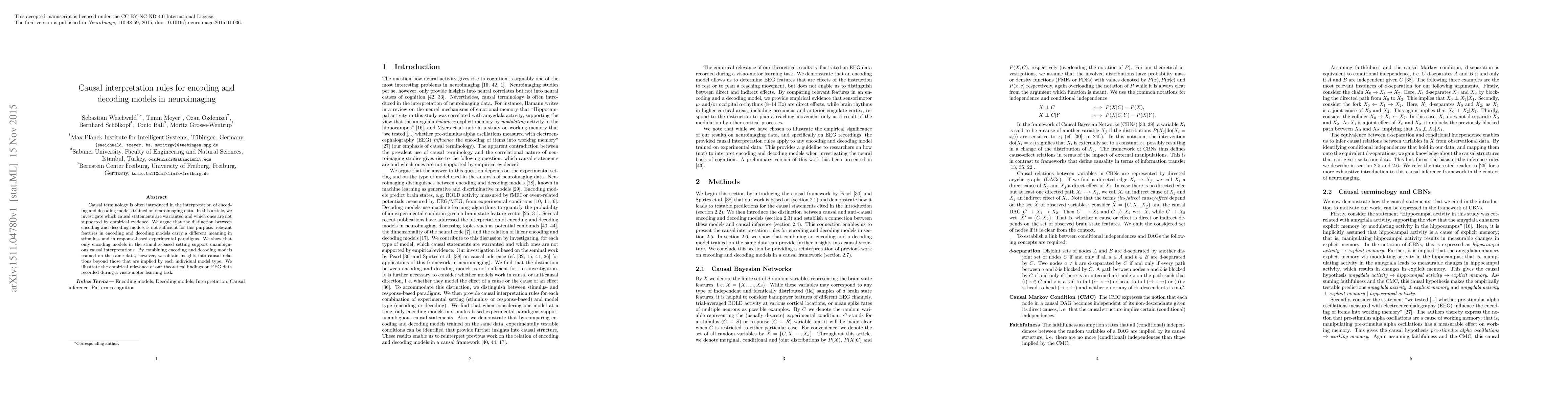 This paper examines the causal interpretations of encoding and decoding models in neuroimaging, arguing that only encoding models in stimulus-based settings allow for clear causal claims. It demonstrates that combining both model types can yield additional causal insights beyond individual models, illustrated with EEG data from a visuo-motor learning task.