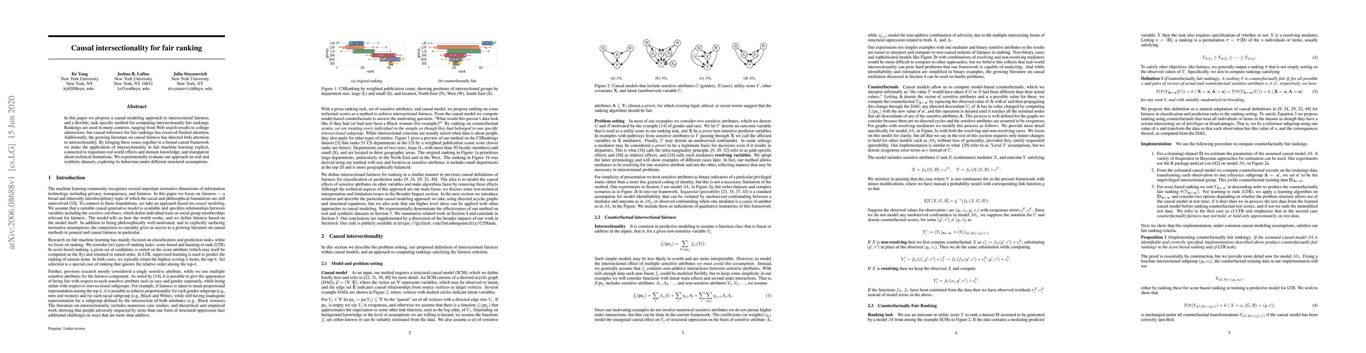 This paper introduces a causal modeling approach to intersectional fairness, proposing a method for computing fair rankings that explicitly incorporates intersectional factors. The authors evaluate their approach on real and synthetic datasets, demonstrating its effectiveness under various structural assumptions.