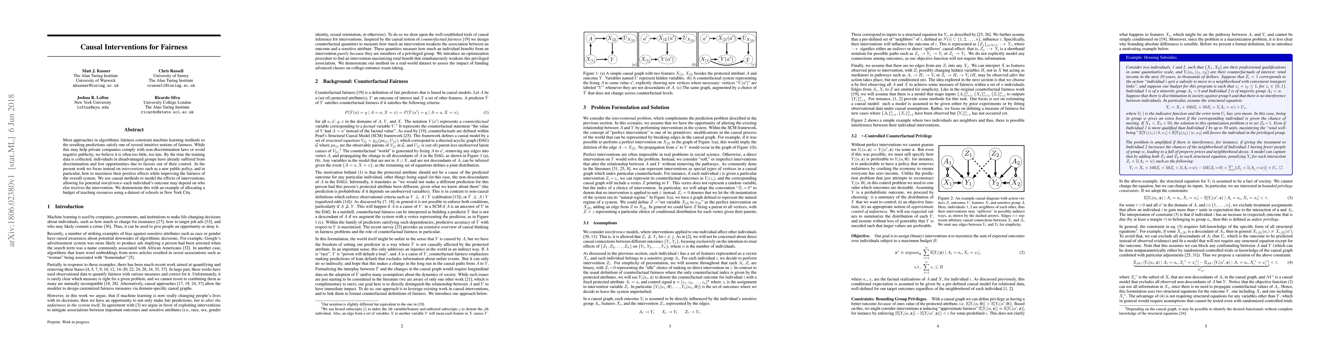 This paper proposes causal interventions to enhance fairness in machine learning by focusing on proactive public policies rather than post-hoc adjustments. It employs causal modeling to optimize the positive effects of interventions, accounting for potential interference among individuals, and illustrates this approach with a case study on allocating teaching resources in New York City schools.