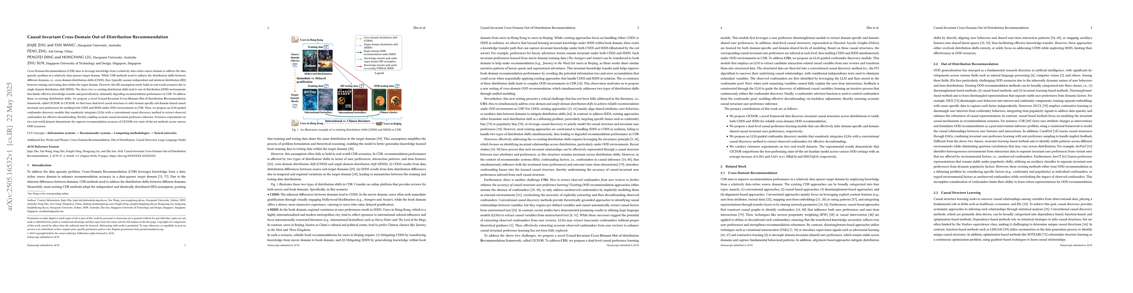 The research proposes CICDOR, a framework that learns dual-level causal structures to infer domain-specific and shared causal-invariant user preferences, addressing both cross-domain distribution shifts (CDDS) and single-domain distribution shifts (SDDS) under out-of-distribution (OOD) environments in Cross-Domain Recommendation (CDR). It integrates large language models (LLMs) with conventional causal discovery methods for effective deconfounding.