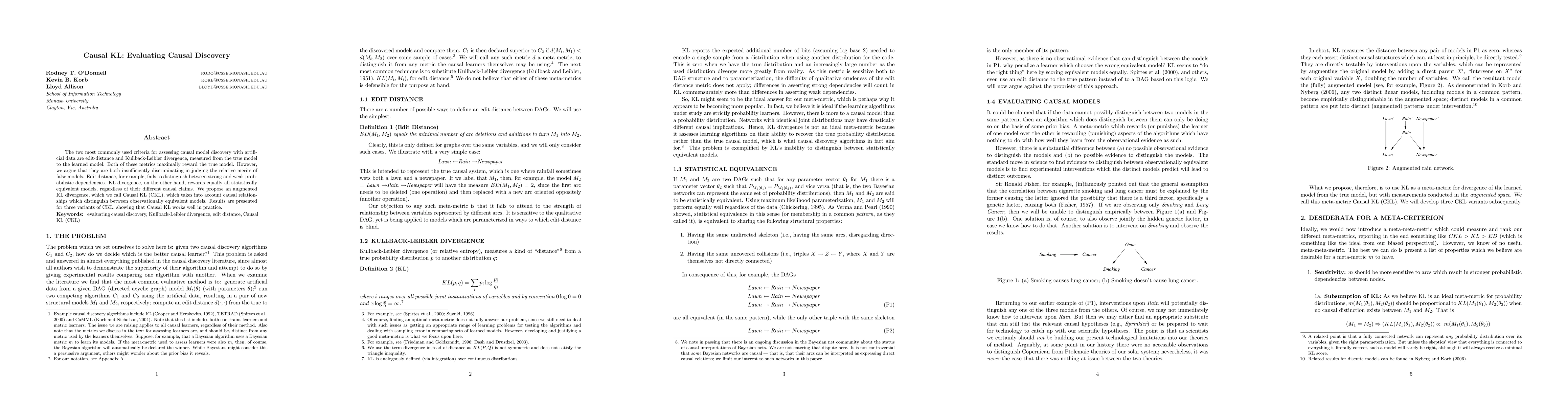 This paper proposes an augmented KL divergence, termed Causal KL (CKL), for evaluating causal discovery models. Unlike traditional metrics like edit distance and standard KL divergence, CKL distinguishes between observationally equivalent models based on their causal relationships, providing a more nuanced assessment of false models.