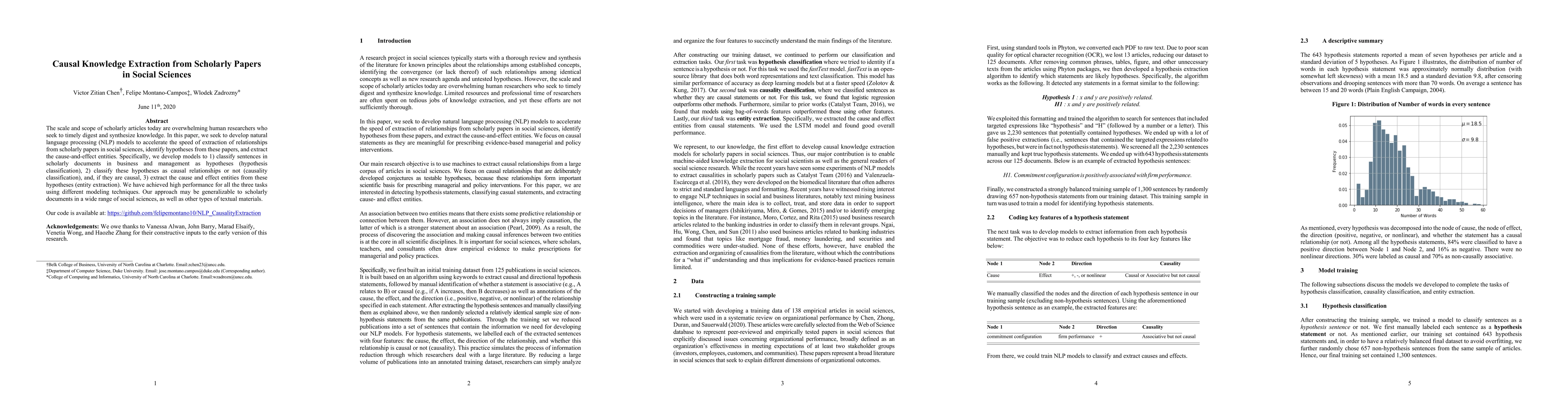 This paper develops NLP models to extract relationships, identify hypotheses, and extract cause-and-effect entities from social science scholarly papers. The models achieve high performance in classifying sentences as hypotheses, determining causality, and extracting causal entities.