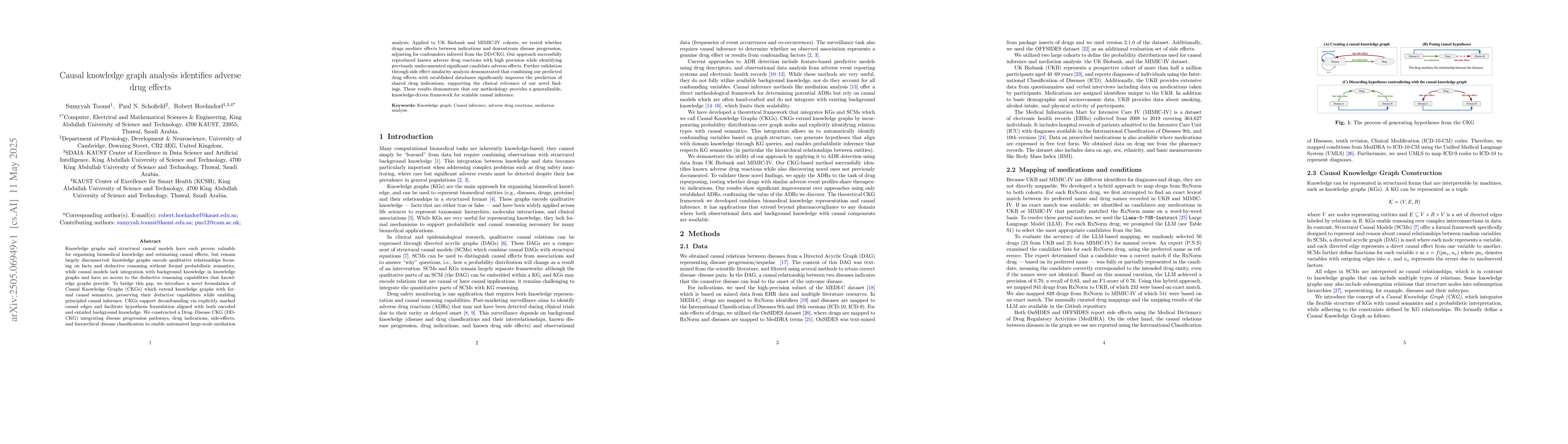 The research introduces Causal Knowledge Graphs (CKGs) that extend knowledge graphs with formal causal semantics, enabling both deductive reasoning and principled causal inference. A Drug-Disease CKG (DD-CKG) was constructed, integrating disease progression pathways, drug indications, side-effects, and hierarchical disease classification for automated large-scale mediation analysis.