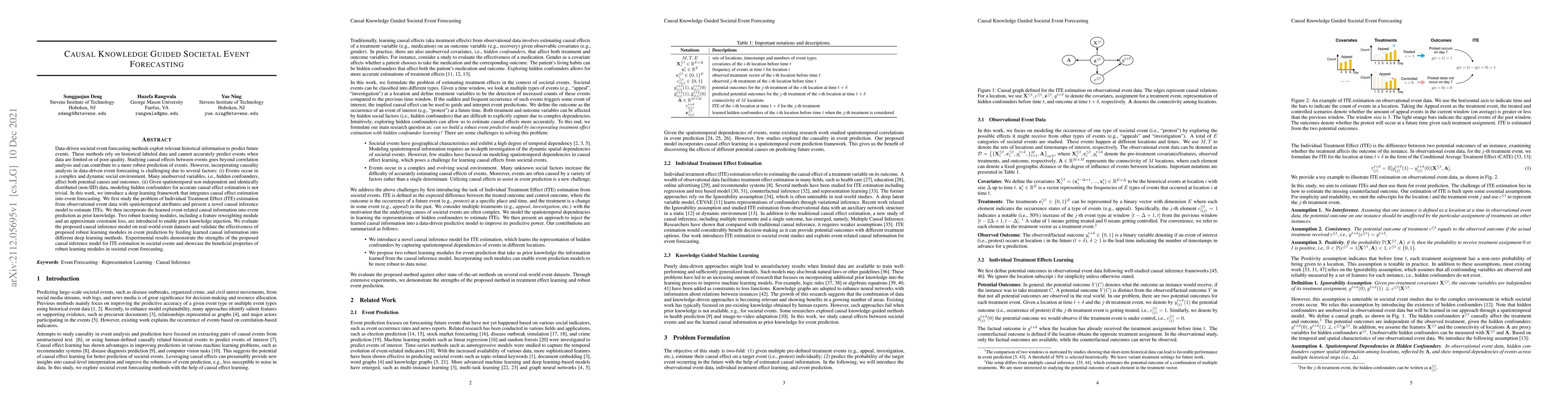 This paper proposes a deep learning framework that integrates causal effect estimation into societal event forecasting to improve predictions under limited or poor data conditions. It introduces a novel causal inference model for estimating individual treatment effects from observational data and incorporates this causal knowledge into event prediction using robust learning modules.