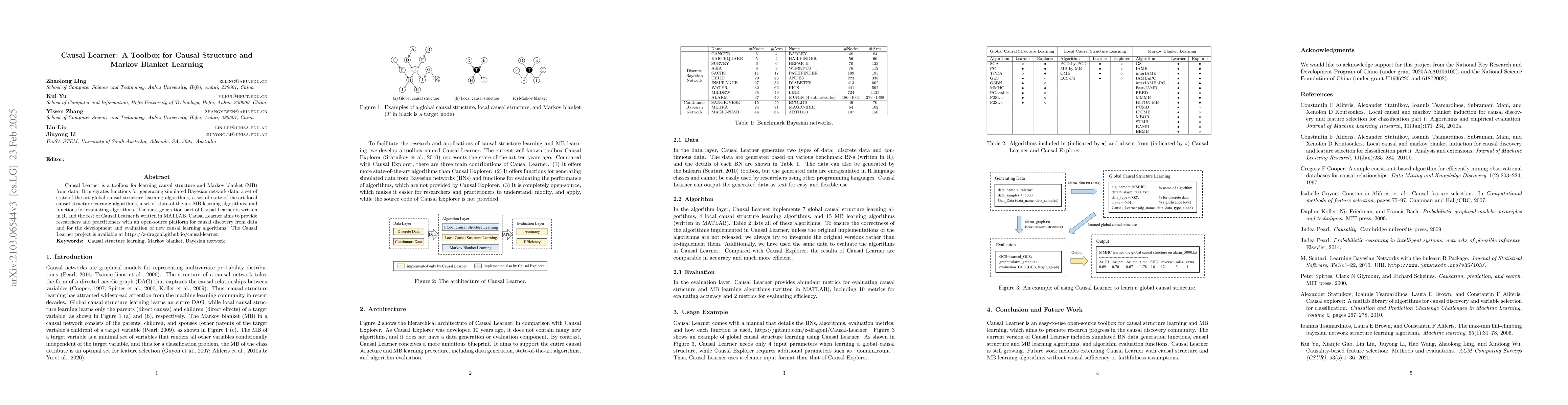 Causal Learner is an open-source toolbox in MATLAB and R for learning causal structures and Markov blankets from data, integrating advanced algorithms for global and local causal structure, and Markov blanket learning, along with evaluation functions. It aims to facilitate research and development in causal learning.