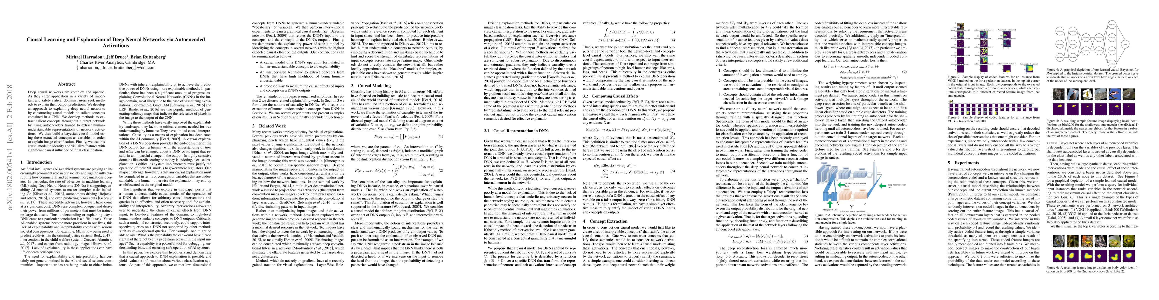 The paper proposes an approach to explain deep neural networks by constructing causal models on salient concepts extracted via autoencoders. These autoencoders are trained to produce human-understandable representations of network activations, which are then used to build a Bayesian causal model for image classification explanation.