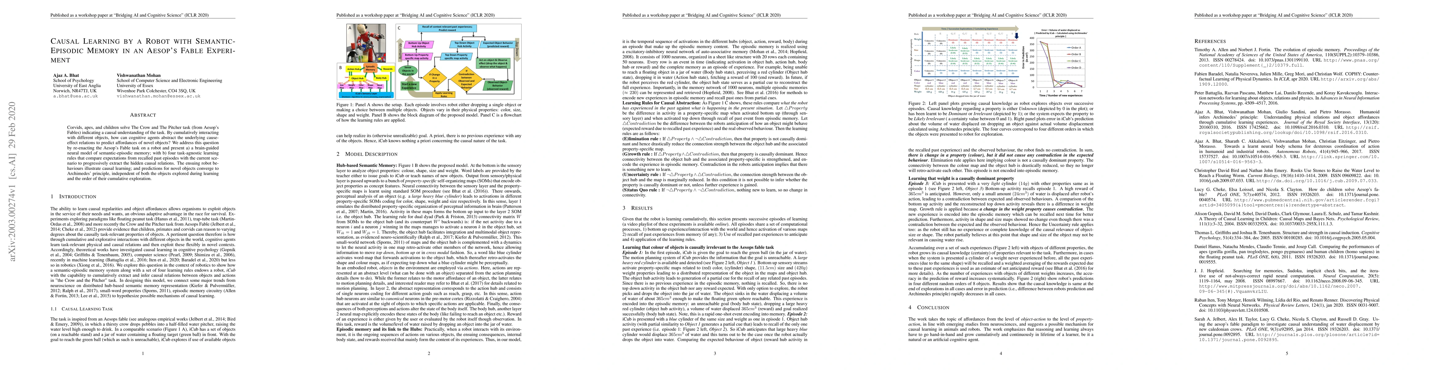 Corvids, apes, and children solve The Crow and The Pitcher task (from Aesop's Fables) indicating a causal understanding of the task. By cumulatively interacting with different objects, how can cognitive agents abstract the underlying cause-effect relations to predict affordances of novel objects? We address this question by re-enacting the Aesop's Fable task on a robot and present a) a brain-guided neural model of semantic-episodic memory; with b) four task-agnostic learning rules that compare expectations from recalled past episodes with the current scenario to progressively extract the hidden causal relations. The ensuing robot behaviours illustrate causal learning; and predictions for novel objects converge to Archimedes' principle, independent of both the objects explored during learning and the order of their cumulative exploration.