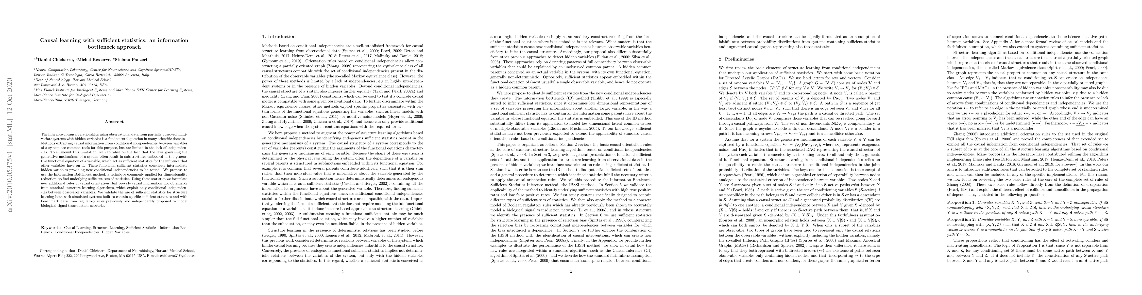 The inference of causal relationships using observational data from partially observed multivariate systems with hidden variables is a fundamental question in many scientific domains. Methods extracting causal information from conditional independencies between variables of a system are common tools for this purpose, but are limited in the lack of independencies. To surmount this limitation, we capitalize on the fact that the laws governing the generative mechanisms of a system often result in substructures embodied in the generative functional equation of a variable, which act as sufficient statistics for the influence that other variables have on it. These functional sufficient statistics constitute intermediate hidden variables providing new conditional independencies to be tested. We propose to use the Information Bottleneck method, a technique commonly applied for dimensionality reduction, to find underlying sufficient sets of statistics. Using these statistics we formulate new additional rules of causal orientation that provide causal information not obtainable from standard structure learning algorithms, which exploit only conditional independencies between observable variables. We validate the use of sufficient statistics for structure learning both with simulated systems built to contain specific sufficient statistics and with benchmark data from regulatory rules previously and independently proposed to model biological signal transduction networks.