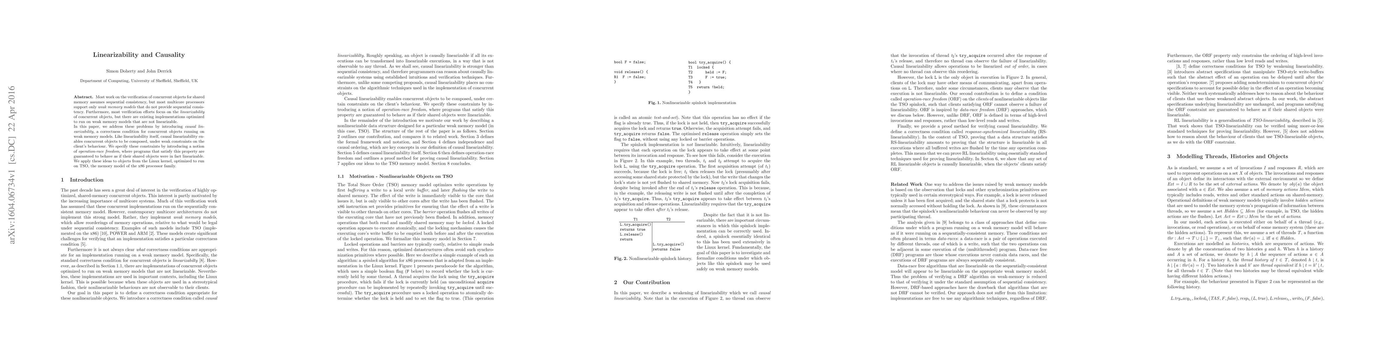Most work on the verification of concurrent objects for shared memory assumes sequential consistency, but most multicore processors support only weak memory models that do not provide sequential consistency. Furthermore, most verification efforts focus on the linearizability of concurrent objects, but there are existing implementations optimized to run on weak memory models that are not linearizable. In this paper, we address these problems by introducing causal linearizability, a correctness condition for concurrent objects running on weak memory models. Like linearizability itself, causal linearizability enables concurrent objects to be composed, under weak constraints on the client's behaviour. We specify these constraints by introducing a notion of operation-race freedom, where programs that satisfy this property are guaranteed to behave as if their shared objects were in fact linearizable. We apply these ideas to objects from the Linux kernel, optimized to run on TSO, the memory model of the x86 processor family.