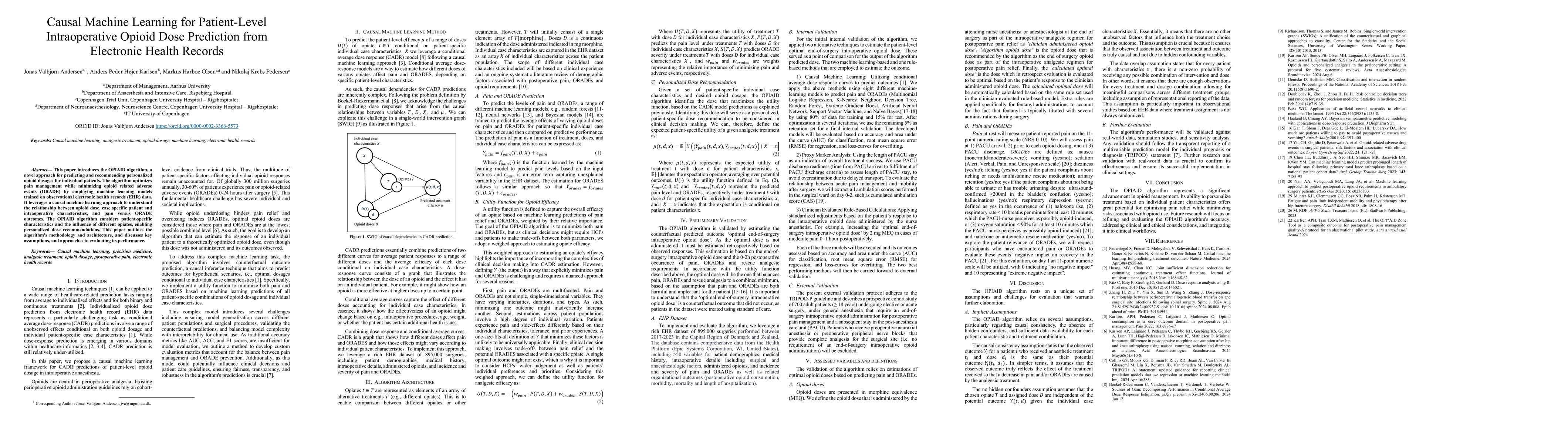 This paper introduces the OPIAID algorithm, a novel approach for predicting and recommending personalized opioid dosages for individual patients. The algorithm optimizes pain management while minimizing opioid related adverse events (ORADE) by employing machine learning models trained on observational electronic health records (EHR) data. It leverages a causal machine learning approach to understand the relationship between opioid dose, case specific patient and intraoperative characteristics, and pain versus ORADE outcomes. The OPIAID algorithm considers patient-specific characteristics and the influence of different opiates, enabling personalized dose recommendations. This paper outlines the algorithm's methodology and architecture, and discusses key assumptions, and approaches to evaluating its performance.