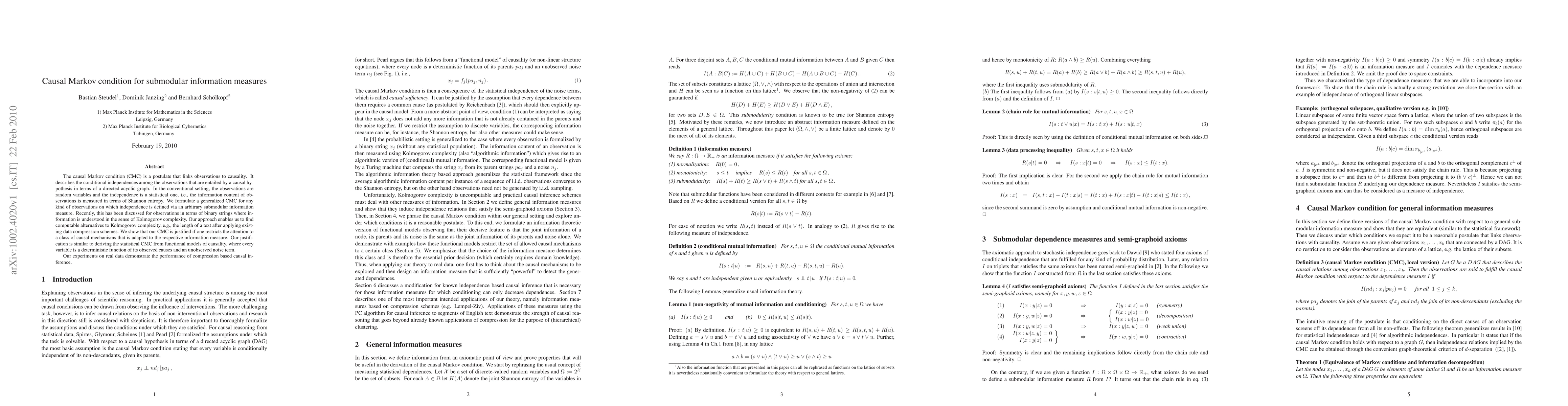 The paper formulates a generalized Causal Markov Condition (CMC) for observations defined via submodular information measures, providing a framework for computable alternatives to Kolmogorov complexity, such as text compression length. Experiments on real data demonstrate the effectiveness of this approach for causal inference.