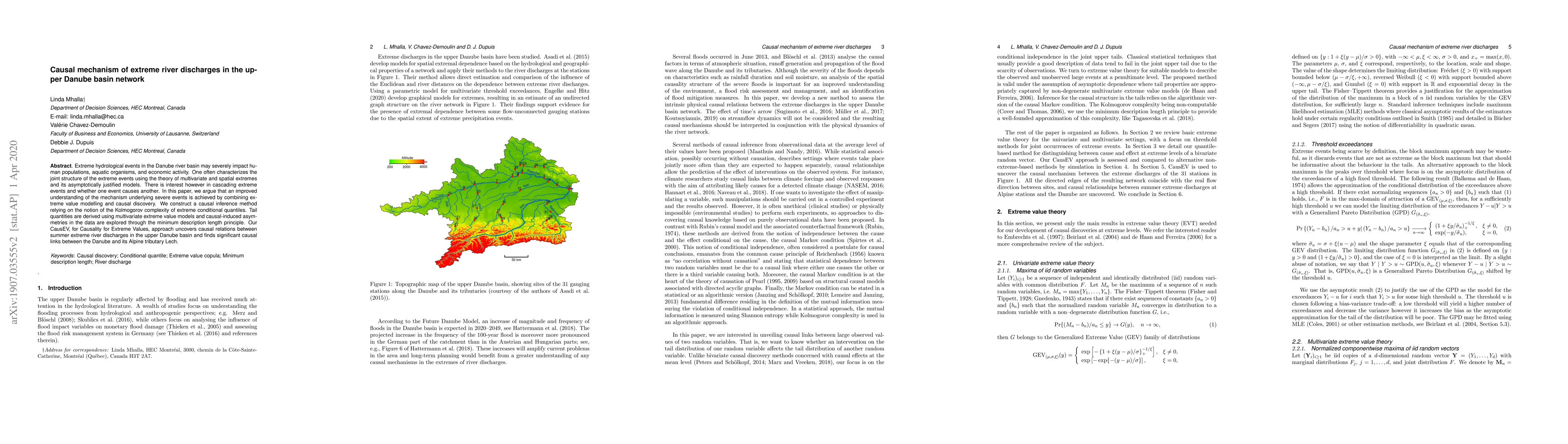 This paper develops a novel causal inference method, CausEV, to explore the causal mechanisms behind extreme river discharges in the upper Danube basin, revealing significant causal links between the Danube and its Alpine tributary Lech using extreme value modeling and causal discovery techniques.