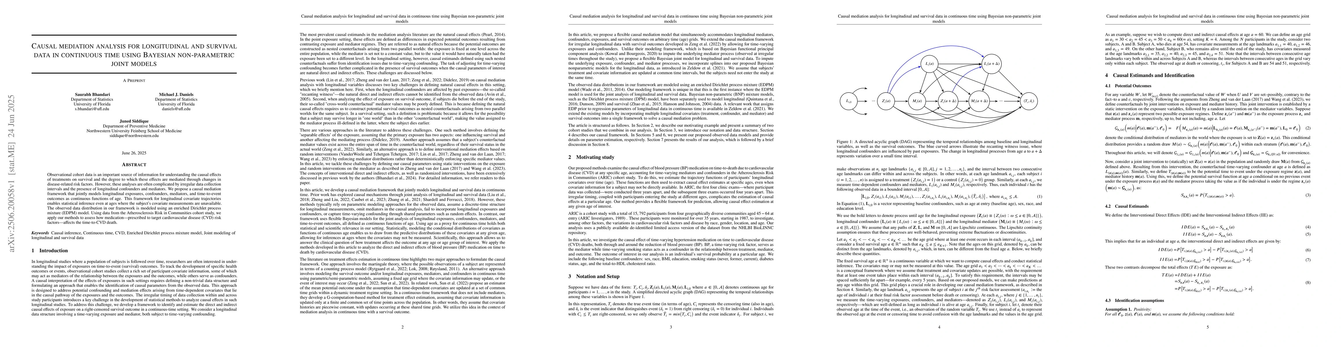 Observational cohort data is an important source of information for understanding the causal effects of treatments on survival and the degree to which these effects are mediated through changes in disease-related risk factors. However, these analyses are often complicated by irregular data collection intervals and the presence of longitudinal confounders and mediators. We propose a causal mediation framework that jointly models longitudinal exposures, confounders, mediators, and time-to-event outcomes as continuous functions of age. This framework for longitudinal covariate trajectories enables statistical inference even at ages where the subject's covariate measurements are unavailable. The observed data distribution in our framework is modeled using an enriched Dirichlet process mixture (EDPM) model. Using data from the Atherosclerosis Risk in Communities cohort study, we apply our methods to assess how medication -- prescribed to target cardiovascular disease (CVD) risk factors -- affects the time-to-CVD death.