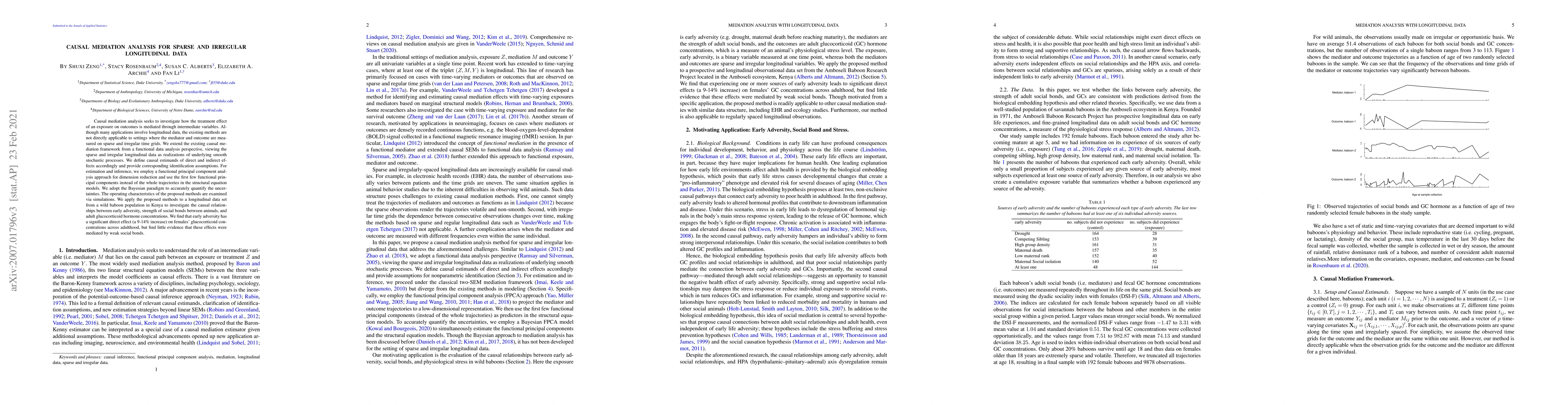 This paper develops a causal mediation analysis framework for sparse and irregular longitudinal data, employing functional data analysis to model underlying smooth processes. The proposed Bayesian approach uses functional principal components for dimension reduction, and is validated through simulations and applied to a baboon population study, revealing a significant direct effect of early adversity on adult glucocorticoid levels without mediation by social bonds.
