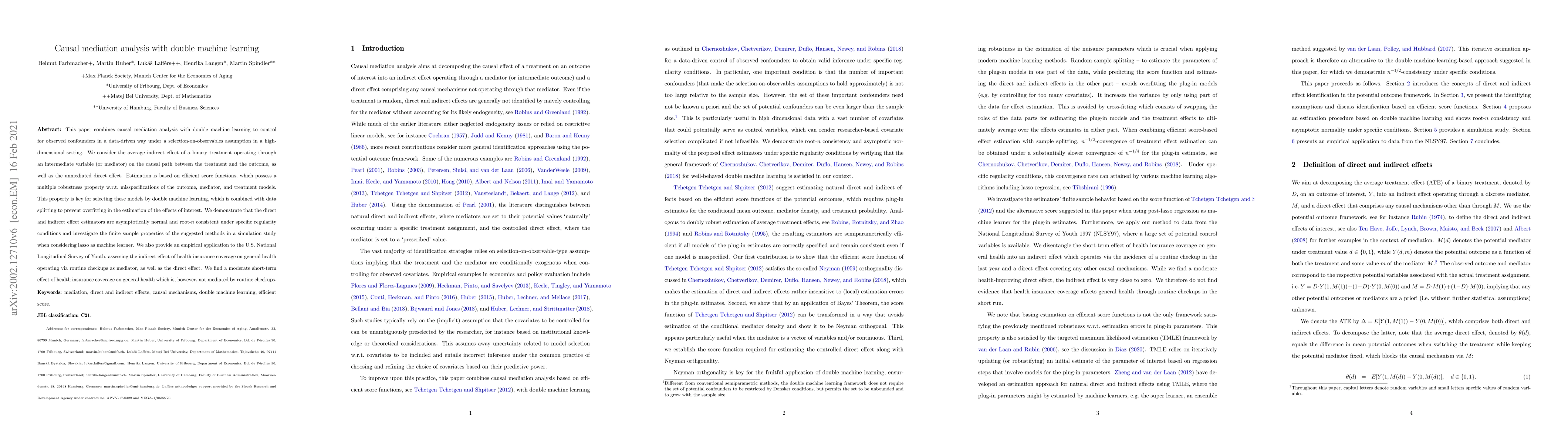This paper integrates causal mediation analysis with double machine learning to estimate direct and indirect effects while controlling for confounders in high-dimensional settings. The proposed method demonstrates robustness and consistency, and is applied to assess the impact of health insurance on health via routine checkups, finding no mediation effect.