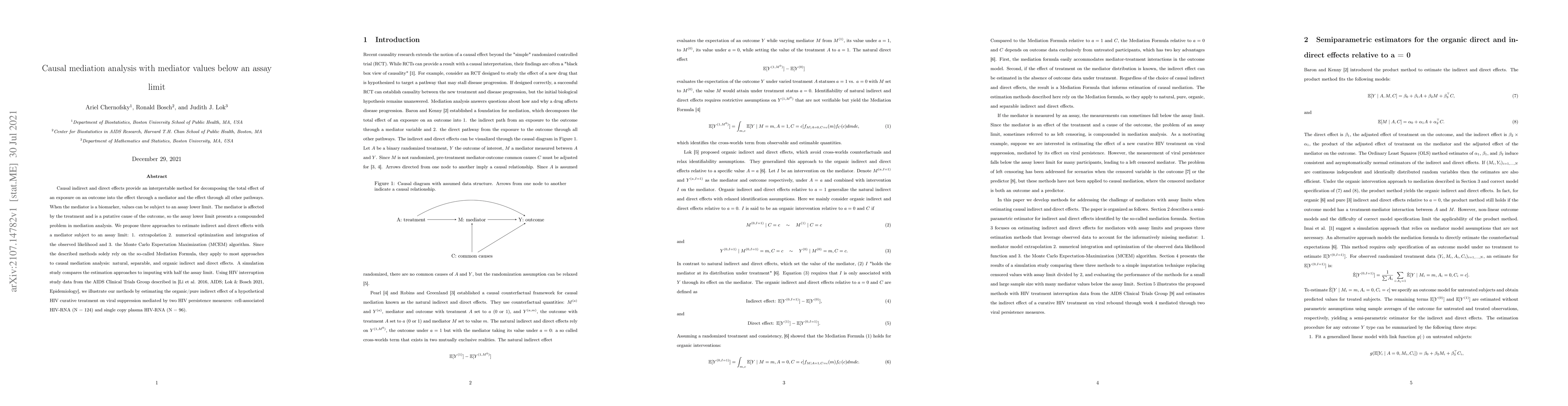 This paper proposes three methods—extrapolation, numerical optimization, and the Monte Carlo Expectation Maximization (MCEM) algorithm—to estimate causal indirect and direct effects when mediator values are below an assay limit. The methods are compared via simulation and illustrated using HIV study data to estimate the indirect effect of a hypothetical HIV curative treatment on viral suppression mediated by HIV persistence measures.