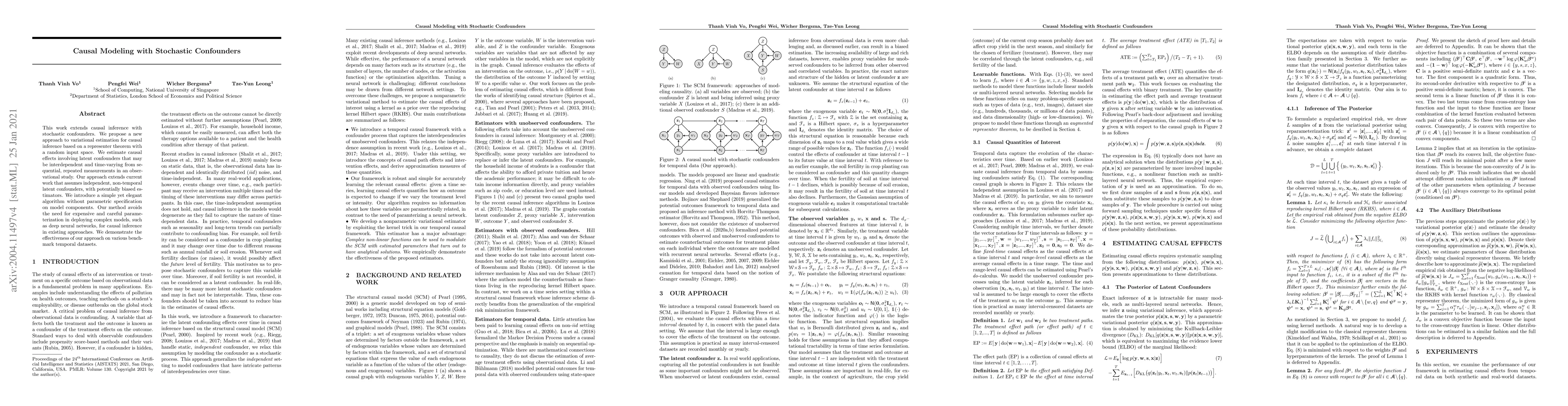 This paper proposes a new variational estimation method for causal inference that handles stochastic confounders, allowing for interdependent and time-varying latent variables. The approach avoids the need for complex parameterization, demonstrating effectiveness on benchmark temporal datasets.