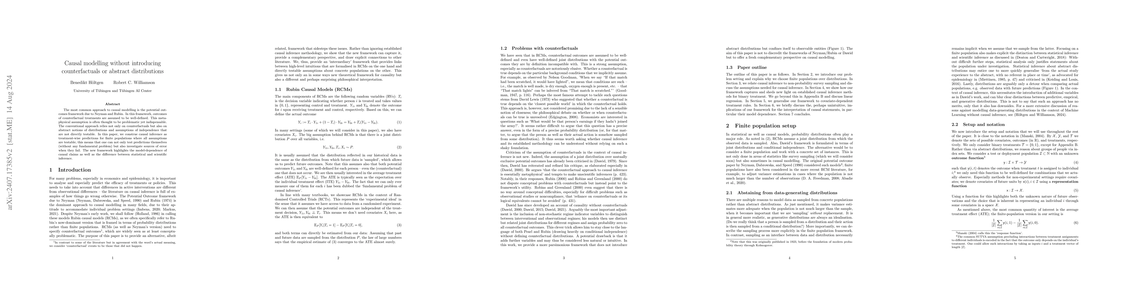 This paper proposes a novel causal modelling approach that avoids counterfactuals and individualised effects, focusing instead on treatment-wise predictions for finite populations. It emphasizes testable assumptions and highlights the model-dependence of causal claims, distinguishing statistical from scientific inference.