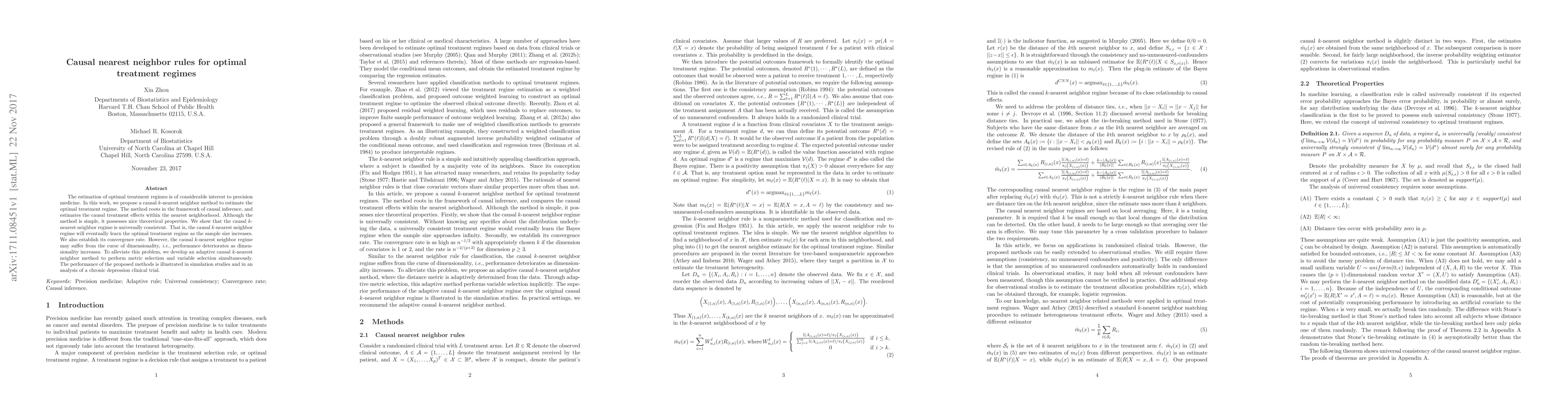 This paper proposes a causal $k$-nearest neighbor method to estimate optimal treatment regimes, demonstrating its universal consistency and convergence rate. To address the curse of dimensionality, an adaptive method incorporating metric and variable selection is developed, validated through simulations and a chronic depression clinical trial analysis.