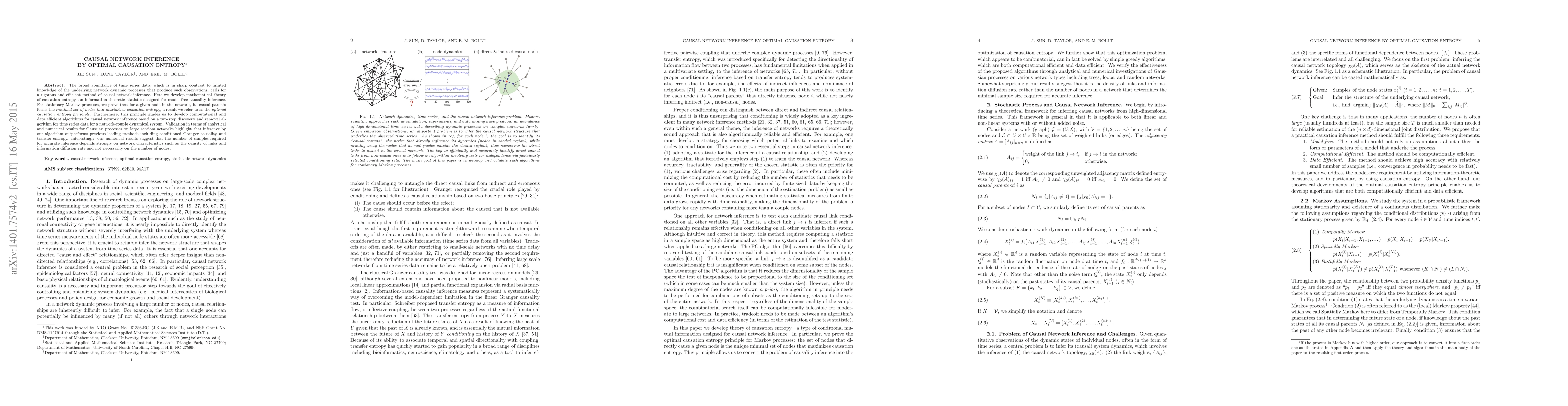 The broad abundance of time series data, which is in sharp contrast to limited knowledge of the underlying network dynamic processes that produce such observations, calls for a rigorous and efficient method of causal network inference. Here we develop mathematical theory of causation entropy, an information-theoretic statistic designed for model-free causality inference. For stationary Markov processes, we prove that for a given node in the network, its causal parents forms the minimal set of nodes that maximizes causation entropy, a result we refer to as the optimal causation entropy principle. Furthermore, this principle guides us to develop computational and data efficient algorithms for causal network inference based on a two-step discovery and removal algorithm for time series data for a network-couple dynamical system. Validation in terms of analytical and numerical results for Gaussian processes on large random networks highlight that inference by our algorithm outperforms previous leading methods including conditioned Granger causality and transfer entropy. Interestingly, our numerical results suggest that the number of samples required for accurate inference depends strongly on network characteristics such as the density of links and information diffusion rate and not necessarily on the number of nodes.