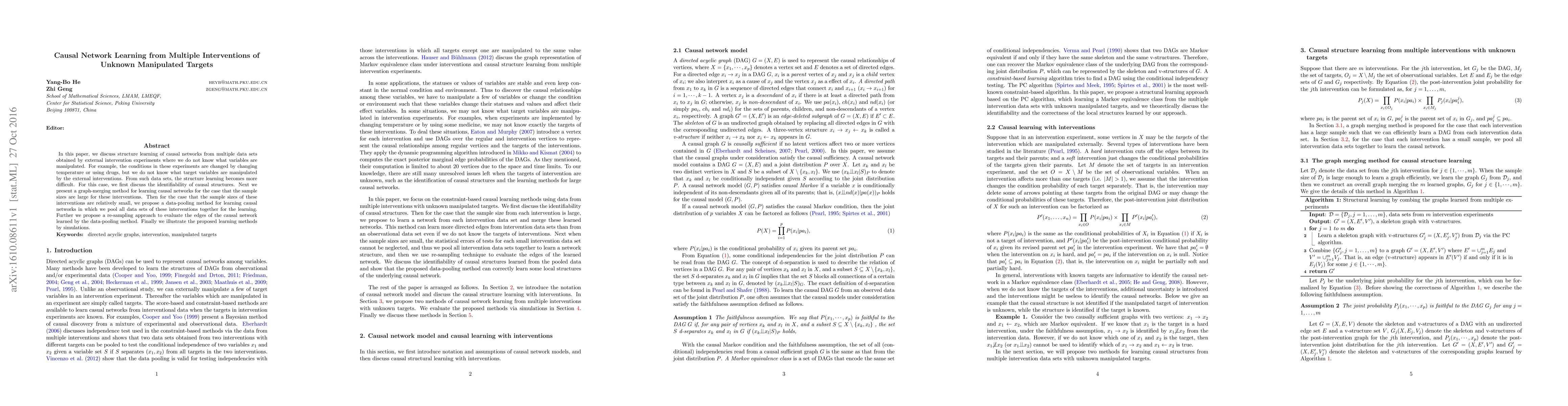 This paper proposes methods for learning causal networks from multiple intervention experiments where the manipulated variables are unknown. It introduces a graph-merging approach for large sample sizes and a data-pooling method for smaller samples, along with a re-sampling technique to evaluate learned network edges, all demonstrated through simulations.