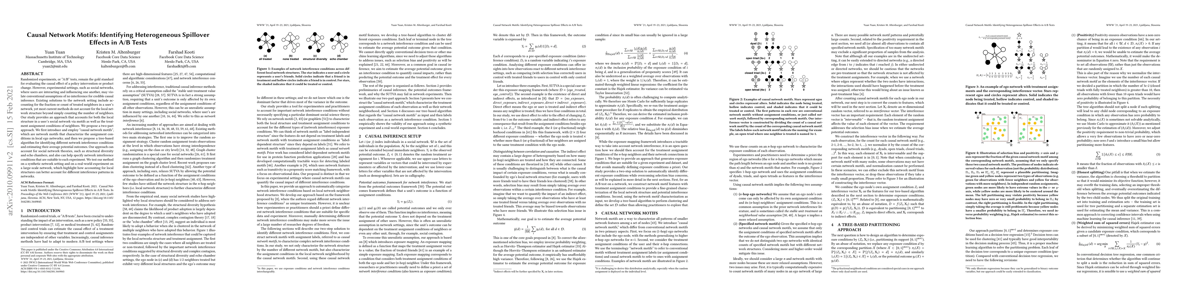 This paper proposes a novel method to identify heterogeneous spillover effects in A/B tests by using "causal network motifs" to account for local social network structures and treatment assignment conditions of neighbors. The approach includes a tree-based algorithm to estimate average potential outcomes under different network interference conditions, demonstrating improved accuracy over traditional methods.