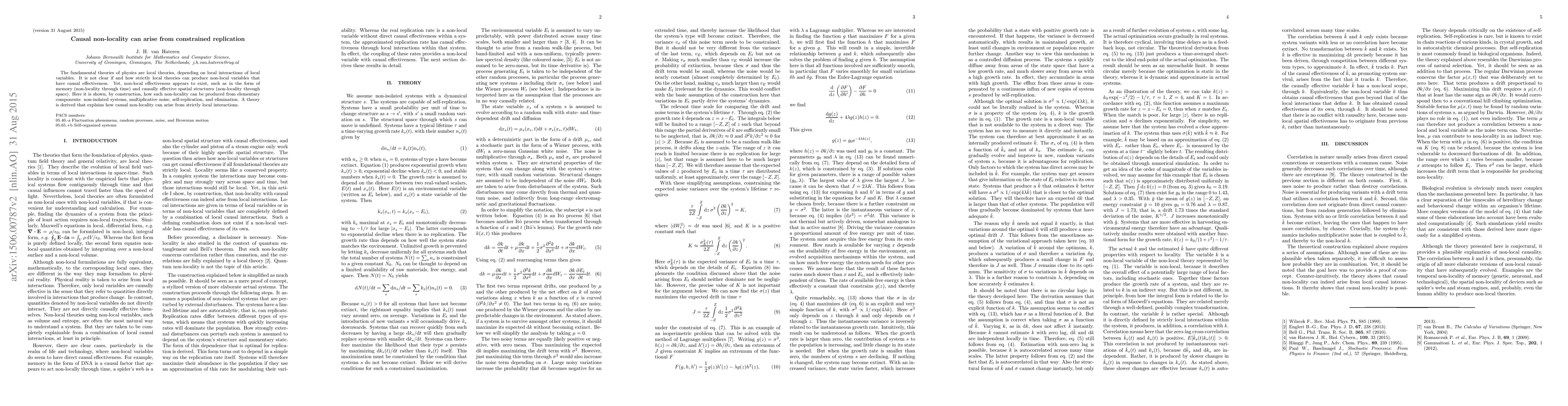 This paper demonstrates how causal non-locality can emerge from strictly local interactions through mechanisms like non-isolated systems, multiplicative noise, self-replication, and elimination. It proposes a theory explaining the origin of non-local causal effects from local components.