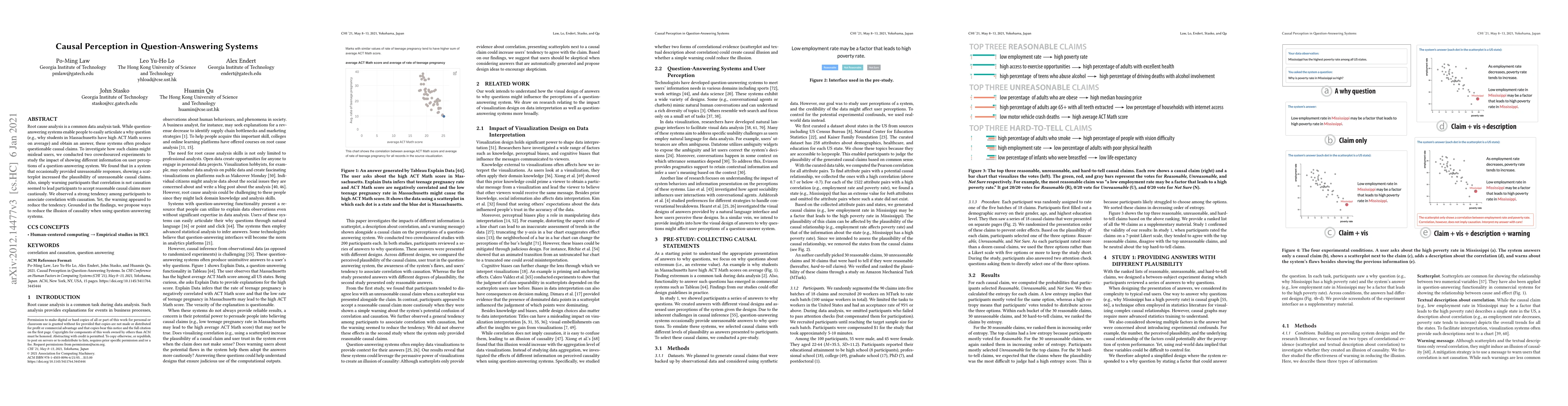 Root cause analysis is a common data analysis task. While question-answering systems enable people to easily articulate a why question (e.g., why students in Massachusetts have high ACT Math scores on average) and obtain an answer, these systems often produce questionable causal claims. To investigate how such claims might mislead users, we conducted two crowdsourced experiments to study the impact of showing different information on user perceptions of a question-answering system. We found that in a system that occasionally provided unreasonable responses, showing a scatterplot increased the plausibility of unreasonable causal claims. Also, simply warning participants that correlation is not causation seemed to lead participants to accept reasonable causal claims more cautiously. We observed a strong tendency among participants to associate correlation with causation. Yet, the warning appeared to reduce the tendency. Grounded in the findings, we propose ways to reduce the illusion of causality when using question-answering systems.