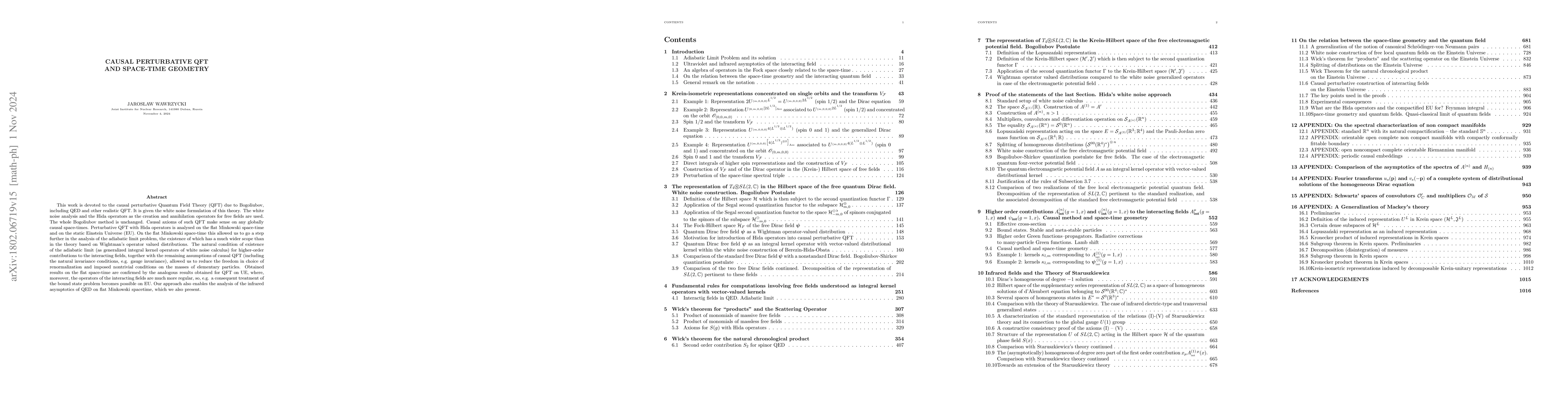 This work is devoted to the causal perturbative Quantum Field Theory (QFT) due to Bogoliubov, including QED and other realistic QFT. The white noise analysis and the Hida operators as the annihilation-creation operators for free fields are used. The whole Bogoliubov method is unchanged. Causal axioms of such QFT make sense on any globally causal space-times. It is proved that on the flat Minkowski spacetime realistic QFT, including QED, lead to the scattering operator and interacting fields understood as generalized operators in the white noise theory of Hida-Obata-Sait\^o with the perturbative series equal to the Fock expansion of these operators in the sense of the white noise calculus and make perfect sense in the adiabatic limit as the generalized operators. But in case of the flat Minkowski space-time the realistic QFT, including QED, can be applied only to the scattering phenomena with the many-particle plane wave generalized states as the \emph{in} and \emph{out} states. Theory is mathematically consistent without any infrared or ultraviolet infinities. Feynman rules are replaced with other much more effective recurrence rules for the higher order contributions to the scattering operator. It is shown that realistic QFT, e.g. QED, are quite singular on the flat Minkowski spacetime with the interacting fields as generalized operators, which are quite singular, which after smearing with test function are not equal to ordinary operators. Bound state problems cannot be treated entirely within QED on the Minkowski space-time. It is proved that on space-times with compact Cauchy surfaces and non-zero curvature realistic causal perturbative QFT, including QED, behave much better. Perturbative series for some realistic QFT are proved to be convergent on the globally causal space-times with nonzero curvature and compact Cauchy surfaces.