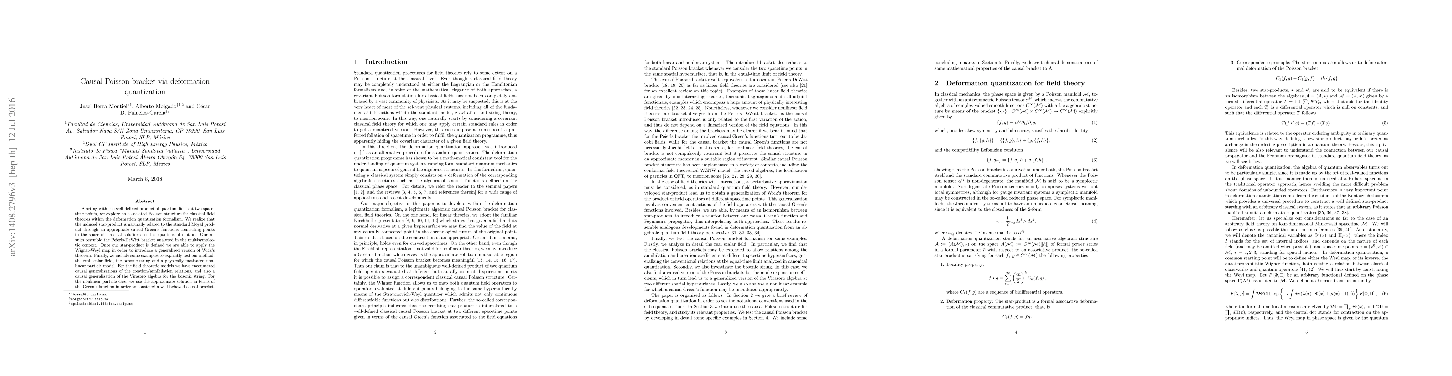 This paper explores the deformation quantization formalism to define a causal Poisson bracket for classical field theories, showing its relation to the Moyal product via causal Green's functions. It introduces a generalized Wick's theorem and applies the method to the real scalar field, bosonic string, and a nonlinear particle model, revealing causal generalizations of creation/annihilation relations and the Virasoro algebra.