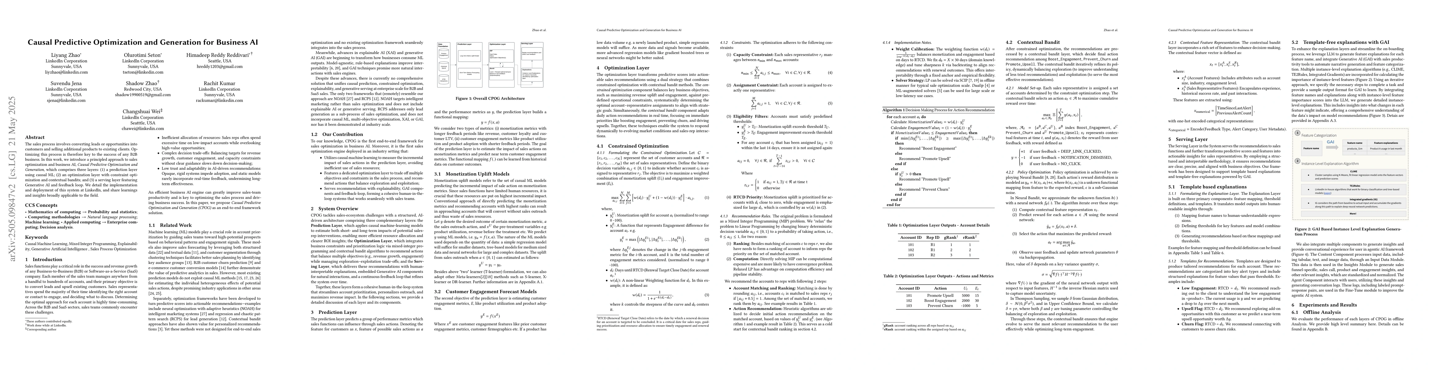 This research paper introduces a principled approach to sales optimization using Causal Predictive Optimization and Generation, which combines machine learning, constraint optimization, and Generative AI to improve business outcomes. The system was successfully deployed on LinkedIn and showed significant wins over legacy systems.