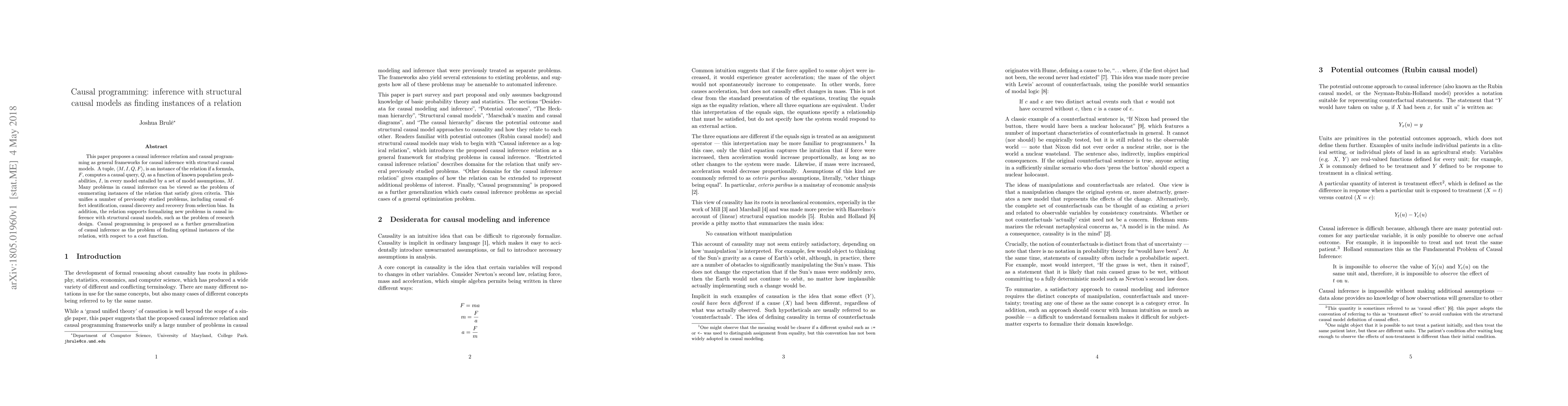 This paper proposes a causal inference relation and causal programming as general frameworks for causal inference with structural causal models. A tuple, $\langle M, I, Q, F \rangle$, is an instance of the relation if a formula, $F$, computes a causal query, $Q$, as a function of known population probabilities, $I$, in every model entailed by a set of model assumptions, $M$. Many problems in causal inference can be viewed as the problem of enumerating instances of the relation that satisfy given criteria. This unifies a number of previously studied problems, including causal effect identification, causal discovery and recovery from selection bias. In addition, the relation supports formalizing new problems in causal inference with structural causal models, such as the problem of research design. Causal programming is proposed as a further generalization of causal inference as the problem of finding optimal instances of the relation, with respect to a cost function.